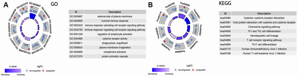 The potential functional enrichment of tmDEGs and immune-related differential genes were analyzed by the “clusterprofile” in R [70]. Functional enrichment included gene ontology (GO) categories in biological processes (BP), molecular functions (MF), cellular components (CC) and Kyoto Encyclopedia of Gene and Genome enriched by (KEGG) Pathway. The threshold of false detection rate (FDR) < 0.05 was considered significant.