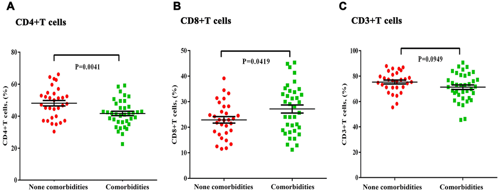 Mounting evidences has confirmed that lymphocytes and lymphocyte subsets are the main protective barrier for cellular and humoral immunity. CD4+ T cells play a key role in regulating CD8+ T cell function, facilitating B-cell responses, and inducing the antibodies that resist virus invasion [14–17]. During the outbreak of SARS and MERS-CoV, more than 80% of patients showed a significant decrease in either CD4+ or CD8+ T cells, which was positively correlated with disease severity [18–20]. In our study, we also found that about 48% of the patients showed a decrease in the number of total lymphocytes, accompanied by a significant decrease in CD4+ T cells subsets. The levels of lymphocyte counts were negatively correlated with inflammatory indices—such as IL-6 and IFN-γ—as well as disease severity, which was more prominent in COVID-19 patients with comorbidities.