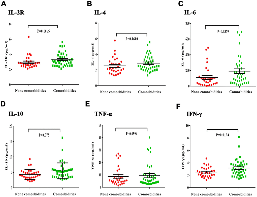 The clinical symptoms in COVID-19 patients are similar to those seen during the SARS-CoV outbreak in 2003, but the disease progression in COVID-19 patients is faster. Some patients show atypical respiratory symptoms at the early stage, but can rapidly progress to acute respiratory distress syndrome (ARDS), multi-organ failure, and death in one to two weeks [5]. These symptoms are more evident in severe COVID-19 patients with chronic medical illnesses. Our study confirmed that COVID-19 patients with comorbidities showed more pronounced leukopenia, lymphopenia, hypokalemia, hypoalbuminemia, coagulation disorders and higher levels of inflammatory indices ESR, CRP, IL-6, and IFN-γ. In addition, the overall prognosis for patients with comorbidities was poor, with longer hospital stays and remission duration.