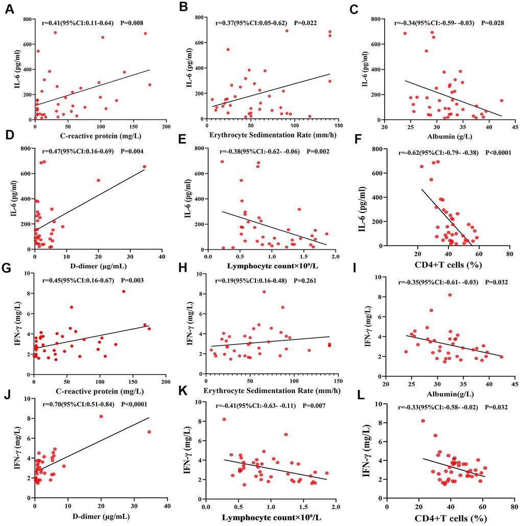 The proportion of CD3+, CD4+, and CD8+ T cell subsets in peripheral blood was also determined (Figure 1A–1C). We found that there was a decrease in the proportion of CD4+ T cells in both groups, which was more pronounced in the comorbidities group (Figure 1A). There was a decrease in the proportion of CD4+ T cells in both groups, which was more pronounced in the underlying diseases group. Baseline serum levels of inflammatory factors IL-2R, IL-4, IL-6, IL-10, and IFN-γ were analyzed (Figure 2A–2F). The patients with comorbidities exhibited higher serum levels of IL-6 and IFN-γ when compared to patients without comorbidities (Figure 2C, 2F). Furthermore, elevated levels of IL-6 were positively correlated with an increase in CRP (r=0.41, P=0.008), ESR (r=0.37, P=0.022) and D-dimer (r=0.47, P=0.004) (Figure 3A, 3B, 3D); and negatively correlated with albumin (r=-0.34, P=0.028), lymphocyte counts (r=-0.38, P=0.002), and the proportion of CD4+T cells subsets (r=-0.62, P<0.0001) (Figure 3C, 3E, 3F). A negative correlation existed between IFN-γ and albumin (r=-0.35, P=0.032), lymphocyte counts (r=-0.41, P=0.007), and the proportion of CD4+T cells subsets (r=-0.33, P=0.032) (Figure 3I, 3K, 3L); while a positive correlation existed between CRP (r=0.45, P=0.003) and D-dimer (r=0.70, P<0.0001) as shown in Figure 3G, 3J.