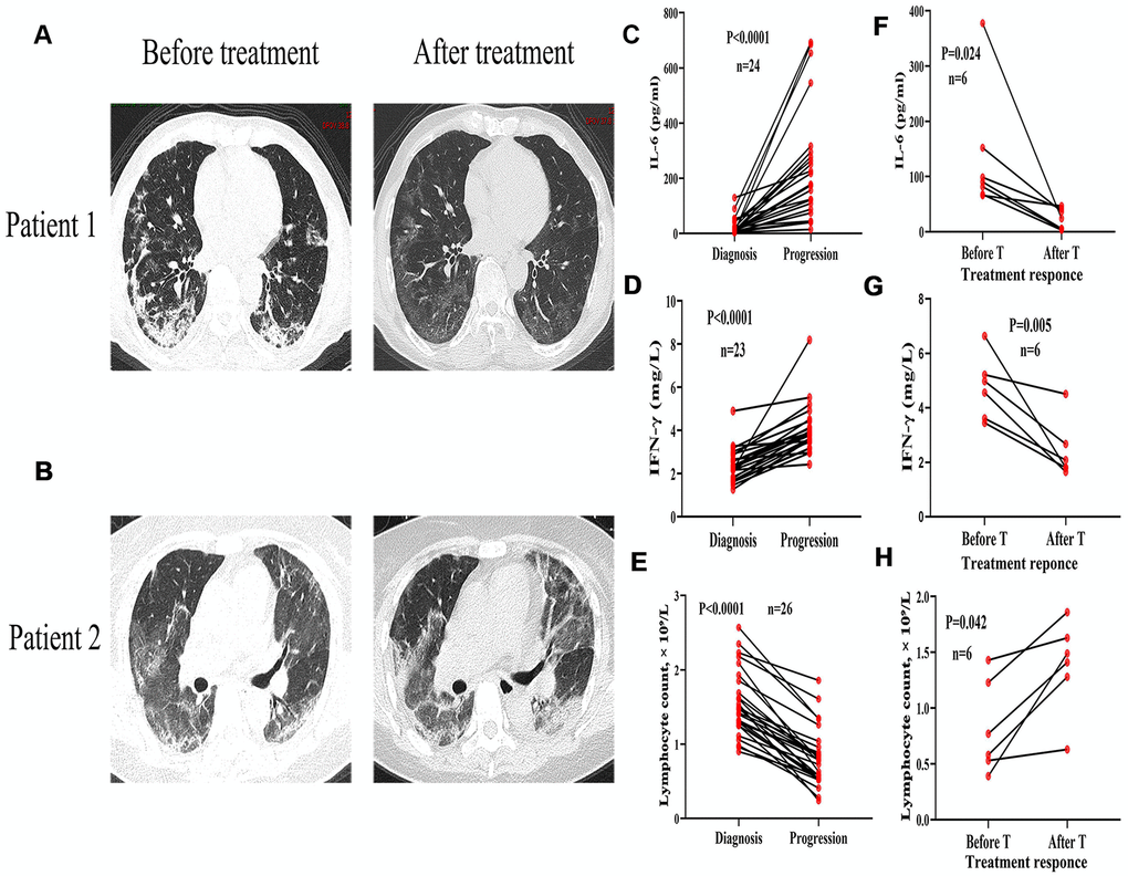 All patients enrolled in this study were regularly examined for chest CT, blood, and serum levels of inflammatory cytokines every 7-10 days following COVID-19 treatment to evaluate the changes in disease development. The signs of disease remission included: relief of symptoms, negative nucleic acid detection of COVID-19 (twice within a 24-h interval), and if the CT images showed a reduction in the size of pulmonary lesions > 20% (Figure 4A). In the comorbidities group, 30 cases showed progress during treatment as characterized by inflammation development in the CT images (Figure 4B), accompanied by elevated levels of IL-6 and IFN-γ, and decreased lymphocyte counts (Figure 4C–4E). In 23 cases of the comorbidities group, decreased levels of IL-6 and IFN-γ as well as improved lymphocyte counts were observed after glucocorticoid treatment (Figure 4F–4H).