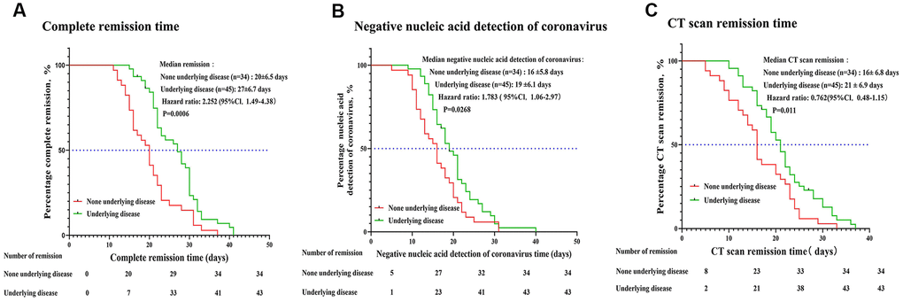 The primary outcome was the disease remission time, defined as the time from the onset of treatment to the negative detection of COVID-19, and CT images of remission. The time for negative coronavirus nucleic acid detection (time from onset treatment to negative nucleic acid detection of coronavirus), and time to CT images remission (time from onset treatment to CT images showing the absorption of lung lesions > 20%) were analyzed. Lymphocyte subsets, inflammatory factors analysis, and their correlation with treatment efficacy were set as a secondary outcome.
