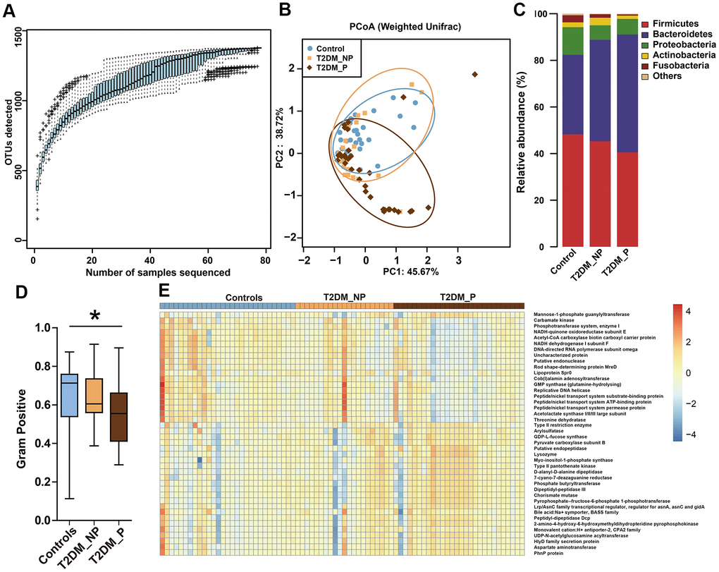 The dominant phyla among participants were Firmicutes, Bacteroidetes, and Proteobacteria (Figure 1C). BugBase algorithm-based prediction suggested that the T2DM_P group exhibited preferential enrichment of gram-positive taxa, compared with the healthy volunteers (Figure 1D). Predicted microbiota functions were determined by KEGG pathway analysis (Figure 1E, Supplementary Table 4). Pathways associated with cytotoxicity that were predicted to be upregulated in the T2DM_P group included the HlyD family secretion protein, UDP-N-acetylglucosamine acyltransferase, and chorismate mutase (Kruskal-Wallis test P < 0.05). Pathways predicted to be downregulated in the T2DM_P group included carbamate kinase, threonine dehydratase, NADH-quinone oxidoreductase subunit E, and acetolactate synthase I/II/III large subunit (Kruskal-Wallis test P < 0.05).