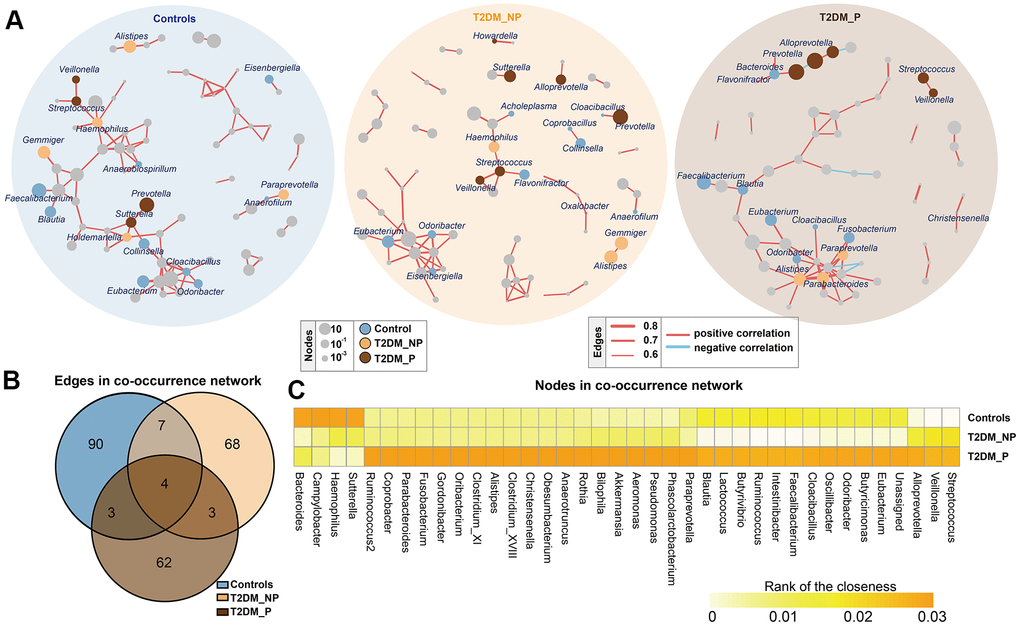 To infer potential interactions among gut bacterial community members, we constructed co-occurrence networks of bacterial genera, based on correlations of their relative abundances (Figure 2). Overall, the co-occurrence network of the T2DM_P group exhibited greater complexity with distinct components and topographies, compared with other groups (Figure 2A). The co-occurrence network of the T2DM_P group was characterized by two unique modules separate from the core module (one comprised Prevotella, Bacteroides, and Alloprevotella, and the other comprised Streptococcus and Veillonella). Specifically, the co-occurrence networks of the T2DM_P and T2DM_NP groups contained 72 and 82 edges, respectively; the co-occurrence network of the control group contained 104 edges (Figure 2B). Despite the presence of some overlapping edges, many edges were specific to each group. Notably, correlations between Romboutsia and Turicibacter, and between Streptococcus and Veillonella, were present in all three groups. Connections containing Butyricimonas, Odoribacter, Oscillibacter, and Eubacterium showed high frequencies of co-occurrence in samples from patients with T2DM, suggesting they were universally associated with T2DM. In addition, the T2DM_P group had more co-exclusion relationships in the bacterial community; in particular, antagonistic relationships between Alloprevotella and Methanobrevibacter, as well as between Bilophila and Actinoplanes, were only observed in the T2DM_P group. We then computed different bacterial network characteristics (i.e., degree, closeness, and betweenness) of shared nodes among bacterial networks to approximate the structural importance of individual bacterial taxa within each respective network (Figure 2C). In terms of the closeness centrality of shared nodes among bacterial networks, several genera appeared to have important effects in the T2DM_P network, including Alistipes, Bilophila, Butyricimonas, Faecalibacterium,Parabacteroides, Streptococcus, Veillonella, Odoribacter, and Pseudomonas.