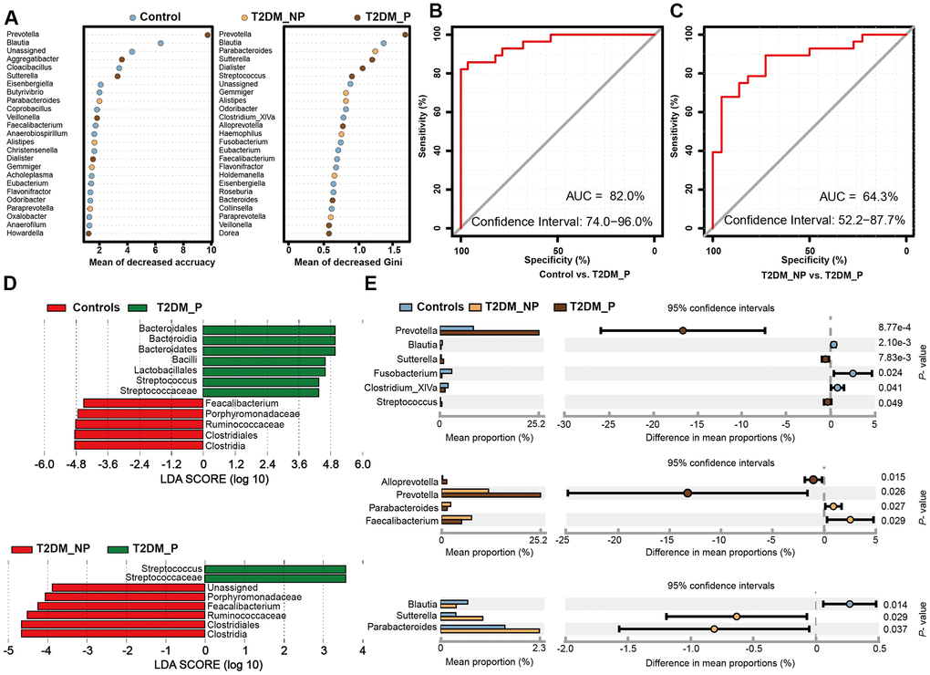 To identify key gut microbiota markers that distinguished participants with different periodontal conditions, we performed fivefold cross-validation analysis using a random forest model (Figure 3A). We created a ROC curve to measure the accuracies at which the relative abundances of key gut microbiota related to periodontitis were able to classify two groups of samples (Figure 3B, 3C). The top 34 OTU markers identified by random forest analysis were able to distinguish the T2DM_P group from healthy volunteers with an area under the ROC curve of 0.82 (95% confidence interval: 74.0%–96.0%); they could distinguish the T2DM_P group from the T2DM_NP group with an area under the ROC of 0.64 (95% confidence interval: 52.2%–87.7%). In addition, we performed LEfSe analysis to confirm the composition of significant differences between groups at various taxonomic levels, especially the Faecalibacterium genus, for which significance was confirmed by the Wilcoxon rank-sum test (Figure 3D, 3E). However, because of high inter-individual variabilities, only seven taxa exhibited significant differences in relative abundance between groups after FDR adjustment (Kruskal-Wallis test, adjusted for age, sex, and use of acarbose; FDR-corrected P < 0.05, Supplementary Table 5). Overall, we found that the abundance of the genus Prevotella was significantly elevated in the T2DM_P group, while the abundance of the genus Faecalibacterium was significantly depleted. At the species level, significantly altered abundances of Prevotella copri and Faecalibacterium prausnitzii (the only species thus far defined in the Faecalibacterium genus) were observed in the T2DM_P group.