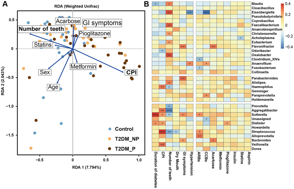 In the present study, we identified key characteristics of gut microbial dysbiosis driven by periodontal complications among elderly patients with T2DM. The results of PERMANOVA community and redundancy analysis indicated that the number of remaining natural teeth and CPI score were the main factors that drove the separation in gut microbiota. Their reversible effects on gut microbiota were more pronounced than the known effects of other influential factors including age, sex and acarbose use [14]. We consistently observed unfavorable metabolic and inflammatory profiles among patients in the T2DM_P group, compared with healthy volunteers or patients in the T2DM_NP group. Our findings showed that altered gut microbiota in patients with T2DM were linked to their periodontal conditions and correlated with several risk factors for advanced T2DM and bone loss.