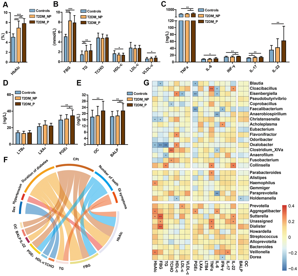 We also investigated the influences of periodontitis on metabolic and inflammatory profiles. The abundances of periodontitis-associated gut microbiota taxa (e.g., Prevotella, Faecalibacterium, Haemophilus, Veillonella,Streptococcus, Aggregatibacter, Oxalobacter, and Eisenbergiella) also exhibited significant correlations with the blood levels of pro-inflammatory cytokines (e.g., PGE2, IFN-γ, IL-17, IL-6, and TNF-α) and plasma metabolic parameters (e.g., HbA1c, fasting blood glucose [FBG], total cholesterol [TCHO], high-density lipoprotein cholesterol [HDL-c], and low-density lipoprotein cholesterol [LDL-c]). Specifically, the T2DM_P group exhibited a significantly elevated Hemoglobin A1c (HbA1c) level, compared with the T2DM_NP group (P = 0.009, Figure 5A); there were no significant differences in other serum metabolic parameters between the T2DM_P and T2DM_NP groups (Figure 5B). Adverse systemic inflammation was observed in the T2DM_P group, compared with the T2DM_NP group. Several inflammatory factors were significantly elevated in the T2DM_P group, including serum levels of tumor necrosis factor α (TNF-α) and Prostaglandin E2 (PGE2) (P = 0.030 and P = 0.036, respectively; Figure 5C and 5D). In addition, bone loss was more serious in the T2DM_P group, as indicated by higher levels of bone alkaline phosphatase and osteocalcin (Figure 5E). Circos plot analysis revealed correlations between clinical characteristics and peripheral risk factors. Correlations were observed between CPI and peripheral concentrations of both PGE2 and HbA1c; a significant correlation was also observed between IL-22 and duration of diabetes. Figure 5G shows a heatmap of the correlation coefficients between circulating metabolic markers and key gut microbiota taxa, as well as between circulating inflammatory markers and key gut microbiota taxa (Supplementary Table 9, 10). The relative abundance of Faecalibacterium was significantly negatively correlated with serum levels of PGE2 and interferon-γ (IFN-γ), whereas the relative abundance of Prevotella was significantly positively correlated with plasma low-density lipoprotein level. Serum levels of PGE2 and IL-6 were negatively correlated with relative abundance of Eisenbergiella and positively correlated with the relative abundance of Aggregatibacter. Additionally, a positive association was observed between the relative abundance of Veillonella and IL-17, while a negative association was observed between the relative abundance of Dorea and IFN-γ; these findings suggested probable contributions to systemic inflammatory responses in periodontitis.