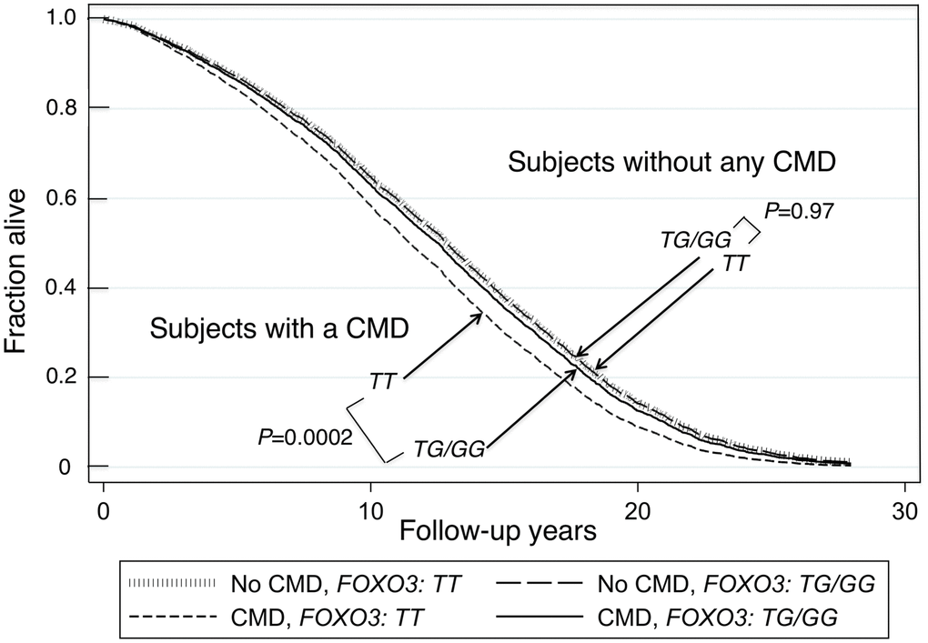 FOXO3 genotype and survival in CMD and non-CMD subjects