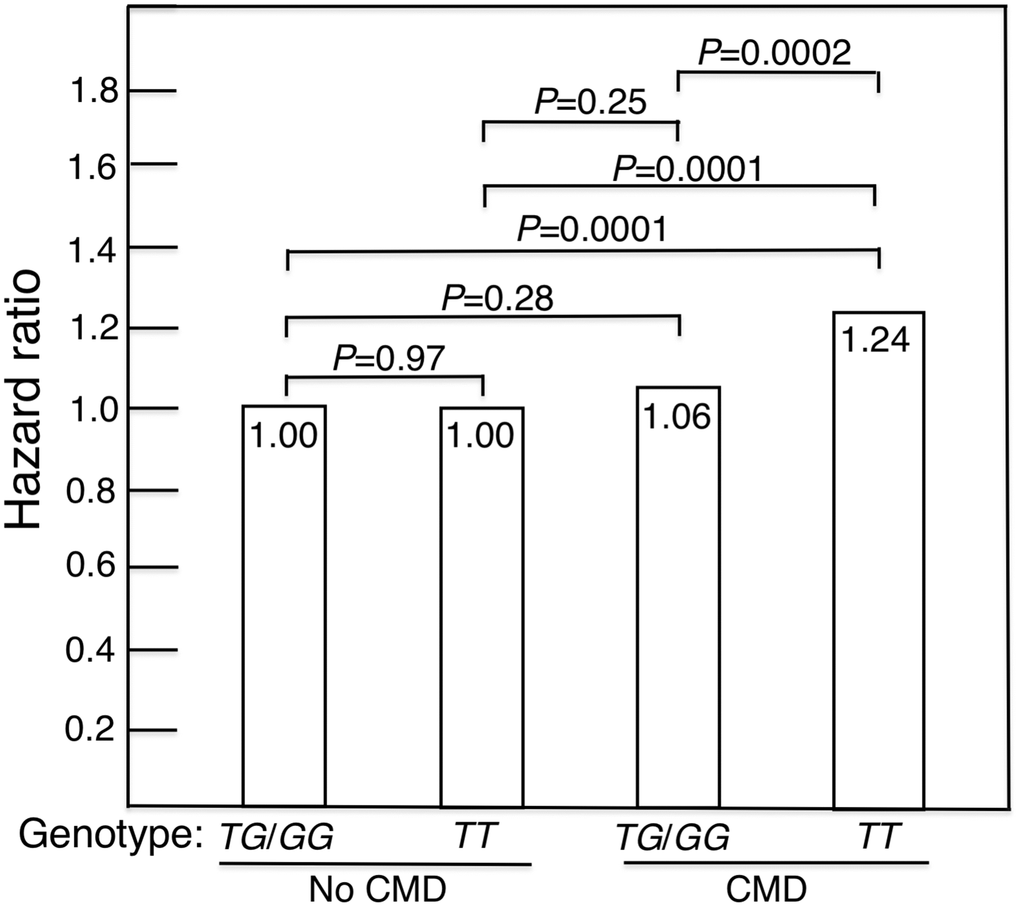 The 14 FOXO3 SNPs (shown in Supplementary Figures 1, 2) likely function as a cis-regulatory unit. Survival curves for men without a CMD and those with a CMD showed that the former lived longer (Kaplan-Meier Log-rank χ2 = 24.8, p = 6.4x10-7). Figure 1 shows survival curves for CMD subjects and subjects without a CMD according to whether they were carriers of the longevity-associated (G) allele of the strongest FOXO3 SNP, rs2802292, or were homozygous for the major (T) allele. These curves were determined using a Cox proportional hazard model adding an interaction term of FOXO3 with CMD. Only in CMD subjects was the G allele associated with greater lifespan than TT (p = 0.0002). Subjects without a CMD had the longest lifespans. Moreover, in contrast to CMD subjects, FOXO3 genotype was not associated with lifespan in subjects without a CMD. Figure 2 shows mortality risk as hazard ratio for CMD subjects and subjects without a CMD according to whether they were carriers of the longevity-associated (G) allele of the strongest FOXO3 SNP, rs2802292, or were homozygous for the major (T) allele. In men with CMD and the FOXO3 longevity genotype, mortality was reduced to that of men without CMD.