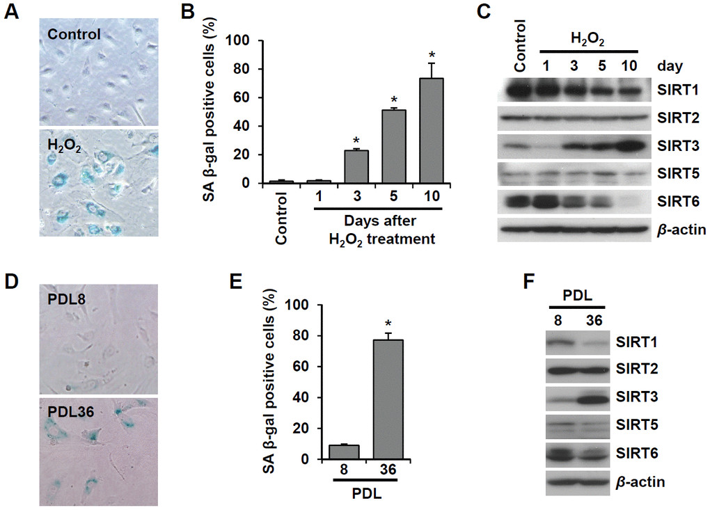 Figure 1. SIRT6 expression is inhibited in endothelial cells during oxidative stress-induced or replicative senescence. (A) Representative image of SA β-gal-positive HUVECs 10 d after the addition of H2O2 (200 μM). (B) The percentage of SA β-gal-positive senescent HUVECs that were treated with 200 μM H2O2 for 1 h and then cultured for the indicated time to generate oxidative stress-induced senescence. The data represent the mean percentage ± SD (n = 3). *P < 0.01 vs. control. (C) Western blot images to analyze the expression of SIRT1, SIRT2, SIRT3, SIRT5, and SIRT6 in HUVECs at 1, 3, 5, or 10 d after addition of H2O2 (200 μM). (D) SA β-gal staining images for young (PDL8) and old (PDL36) cells. (E) The percentage of SA β-gal-positive HUVECs that were passaged to induce replicative senescence. The data are shown as the mean ± SD (n = 3). *P < 0.01 vs. young cells. (F) The expression of SIRTs in young and old HUVECs. An antibody recognizing β-actin was used as a loading control.
