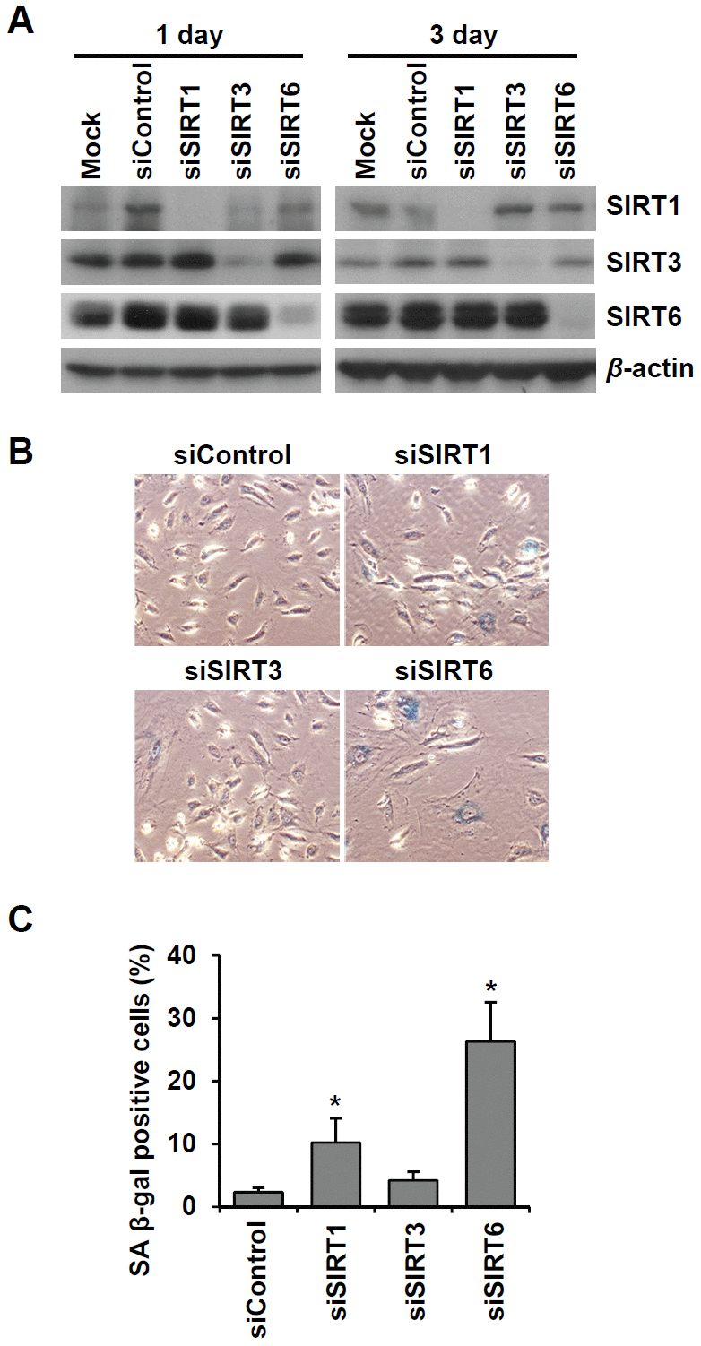 Figure 2. Knockdown of SIRT6 expression induces endothelial cell senescence. (A) Western blot analysis showing the knockdown expression of SIRT1, SIRT3, and SIRT6 in HUVECs treated with SIRT1, SIRT3, and SIRT6 siRNAs, respectively. Total protein was extracted from cells 1 and 3 d after siRNA treatment. (B) The representative images obtained from SA β-gal-stained HUVECs. The cells transfected with the indicated siRNA (25 nM) were re-transfected with the siRNA 3 d after the first siRNA treatment. After 6 d from the first transfection, cells were stained for SA β-gal. (C) The percentage of SA β-gal-positive senescent cells at 6 d after siRNA transfection. The data are shown as the mean ± SD (n = 3). *P < 0.05 vs. control siRNA.