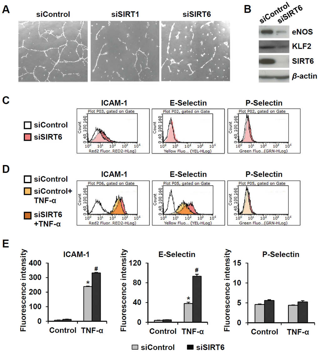 Figure 3. Downregulated expression of SIRT6 induces endothelial cell dysfunction. (A) Effect of SIRT6 siRNA on in vitro tube formation in HUVECs. HUVECs transfected with 25 nM of the indicated siRNA were cultured on Matrigel to check in vitro angiogenesis activity of endothelial cells. The representative micrographs of tube formation in HUVECs. (B) Western blot analysis showing the effect of SIRT6 siRNA on the expression of eNOS and KLF2. β-Actin was used as a loading control. (C, D) Representative flow cytometry plots showing the effect of SIRT6 knockdown on cell surface expression of ICAM-1, E-selectin, and P-selectin. HUVECs transfected with 25 nM control or SIRT6 siRNA were treated or not treated with TNF-α (50 ng/mL) for 4 h. Cells were stained with the fluorochrome-conjugated antibodies and analyzed by flow cytometry. (E) Graphs showing ICAM-1, E-selectin, and P-selectin expression levels in the cells. Data were obtained by analyzing the mean fluorescence intensity of each inflammatory molecule on HUVECs, which were differentially treated with control or SIRT6 siRNA in the absence and presence of TNF-α. *P < 0.01 vs. control siRNA. #P < 0.01 vs. control siRNA with TNF-α.