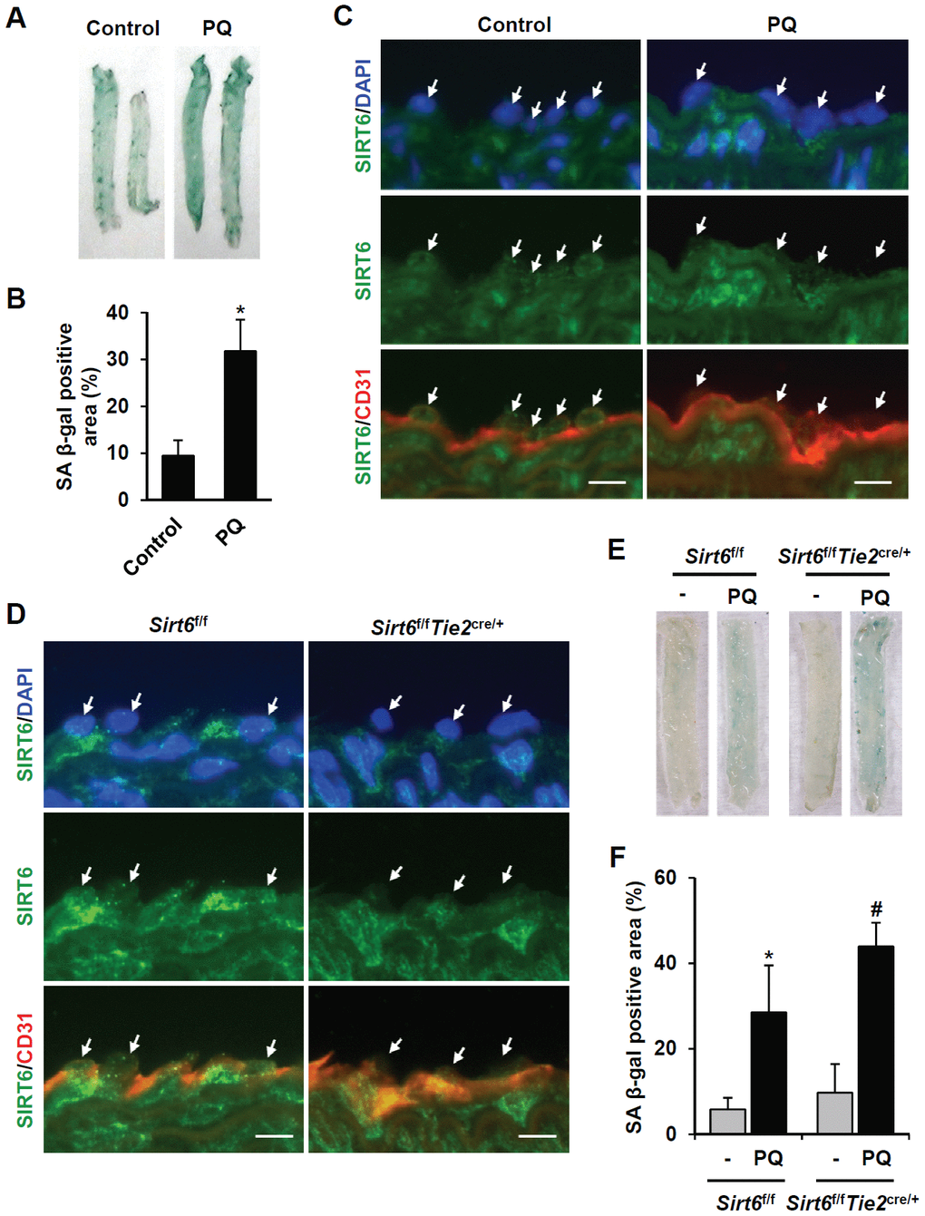 Figure 4. SIRT6 expression is downregulated in mouse senescent aorta, and endothelial-specific Sirt6 knockout in mouse deteriorates oxidative stress-induced senescence in the aorta. (A) Images from SA β-gal staining of thoracic aorta from C57/BL6 mice injected with PBS or PQ. (B) Graph showing the relative SA β-gal-positive areas in PBS- and PQ-treated thoracic aortas. SA β-gal-positive areas were quantified using ImageJ. The experiment was repeated twice. Data represent the mean percentage ± SD (n = 4). *P < 0.05 vs. control treatment. (C) Double immunofluorescence staining showing SIRT6 and CD31 expression in control and PQ-treated thoracic aortas. The sections were co-stained with anti-SIRT6 and anti-CD31 antibodies. DAPI was used to stain nuclei. Arrows indicate nuclei of endothelial cells. Scale bars represent 10 μm. (D) Double immunofluorescence staining confirming Sirt6 knockout in Sirt6f/fTie2cre/+ mouse thoracic aortas. The sections were co-stained with anti-SIRT6 and anti-CD31 antibodies. DAPI was used to stain nuclei. Arrows indicate nuclei of endothelial cells. Scale bars represent 10 μm. (E) Dissecting microscope images of thoracic aortas stained for SA β-gal. The thoracic aortas were obtained from Sirt6f/f and Sirt6f/fTie2cre/+ mice injected with PBS or PQ. (F) Relative SA β-gal-positive areas in the mouse thoracic aortas from Sirt6f/f and Sirt6f/fTie2cre/+ mice injected with PBS or PQ. The percentage of SA β-gal-positive areas was quantified using ImageJ. The experiment was repeated twice. Data are shown as the mean ± SD (n = 4). *P < 0.05 vs. control Sirt6f/f. #P < 0.05 vs. Sirt6f/f treated with PQ.