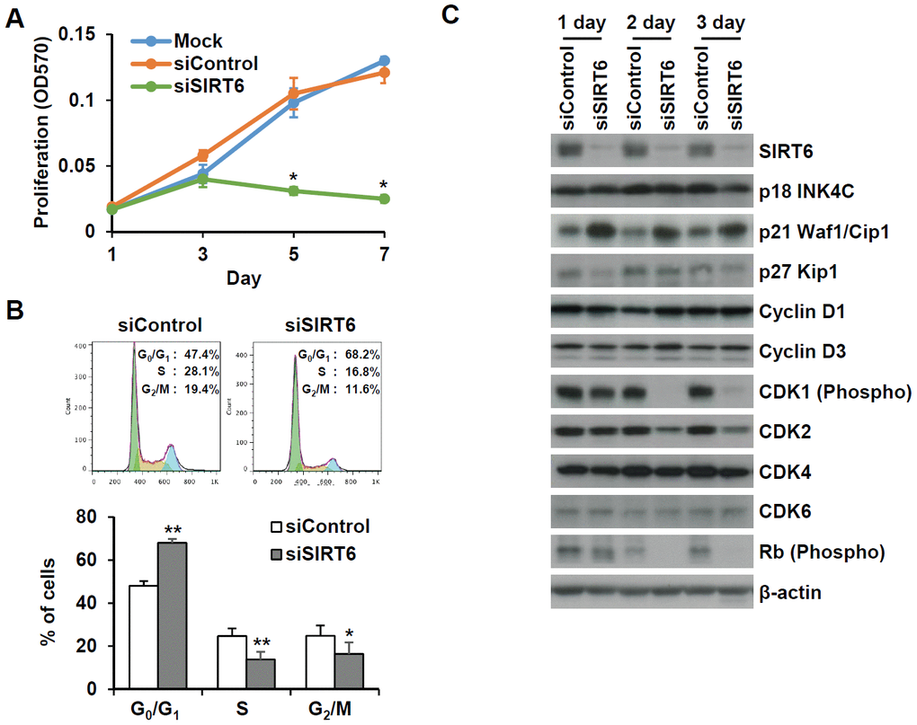Figure 6. SIRT6 knockdown significantly induces cell proliferation in endothelial cells. (A) MTT assay showing the effect of SIRT6 knockdown on endothelial cell proliferation. HUVECs were transfected with 25 nM control or SIRT6 siRNA and incubated for the indicated number of days. *P < 0.01 vs. control siRNA. (B) Cell cycle analysis indicating that SIRT6 siRNA induces cell cycle arrest in endothelial cells. HUVECs were transfected with 25 nM control or SIRT6 siRNA. After 3 d, cells were stained with PI and analyzed using flow cytometry. Graphs show the mean percentage ± SD of cells in G0/G1, S, and G2/M phases. *P < 0.05 vs. control siRNA. **P < 0.01 vs. control siRNA. (C) Western blot analysis to determine the effect of SIRT6 knockdown on the expression of cell cycle regulators. β-Actin was used as a loading control.