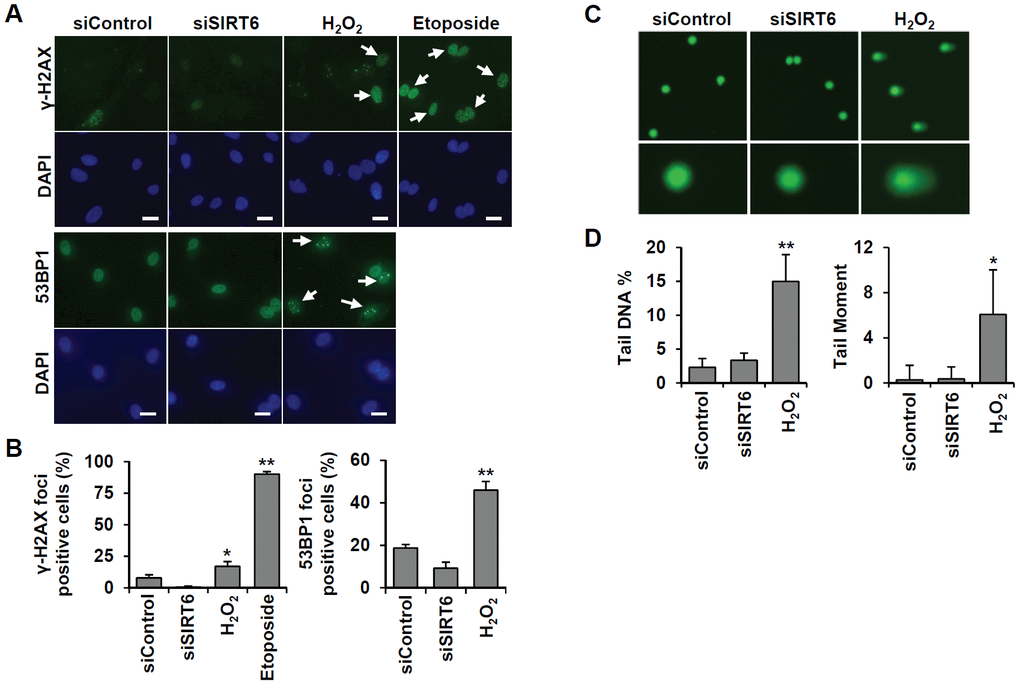 Figure 7. SIRT6 knockdown does not directly induce DNA damage at the times when the cell cycle is inhibited. (A) Representative images for the effect of SIRT6 knockdown on the formation of DNA damage foci. HUVECs were transfected with 25 nM control or SIRT6 siRNA. H2O2 (200 μm) and etoposide (10 μm) were used as positive controls to induce DNA damage. After 3 d, cells were stained with anti-γ-H2AX and anti-53BP1 antibodies. DAPI was used to stain nuclei. Scale bars represent 20 μm. (B) Quantification of DNA-damaged cells. Cells with more than ten γ-H2AX or five 53BP1 foci were scored. Data are expressed as the mean ± SD (n = 3). *P < 0.05 vs. control siRNA. **P < 0.001 vs. control siRNA. (C) Comet images of HUVECs treated with control or SIRT6 siRNA. HUVECs were treated with 25 nM control or SIRT6 siRNA. After 3 d, dissociated single cells were subjected to alkaline comet assay. Cells treated with H2O2 for 1 h were used as positive control. (D) Analysis of comet images. Percent DNA in the tail and tail moment of damaged cells were quantified using OpenComet. Data are expressed as the mean ± SD (n = 3). *P < 0.05 vs. control siRNA. **P < 0.01 vs. control siRNA.
