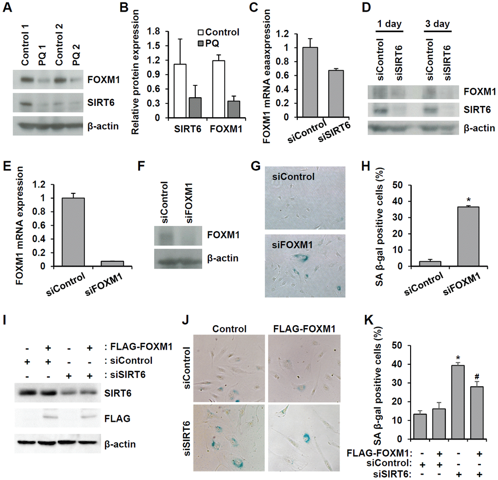 Figure 8. Downregulated SIRT6 expression inhibits FOXM1 expression, which is closely related to endothelial cell senescence. (A) Western blot analysis showing downregulation of FOXM1 and SIRT6 expression in thoracic aortas of mice treated with PBS or PQ. (B) Relative SIRT6 and FOXM1 protein expression in control and PQ-treated aortas. The protein expression was quantified using Bio-Rad Image Lab software. Relative expression was normalized to β-actin. (C) Real-time RT-PCR analysis indicating that SIRT6 knockdown transcriptionally inhibited FOXM1 expression. (D) Western blot analysis presenting the effect of SIRT6 knockdown on FOXM1 protein expression. (E) Real-time RT-PCR confirming the efficient knockdown of FOXM1 expression in endothelial cells by 25 nM FOXM1 siRNA. (F) Western blot analysis to show the knockdown of FOXM1 protein in FOXM1 siRNA-treated HUVECs. (G) Representative images of SA β-gal-positive senescent HUVECs that were transfected with control or FOXM1 siRNA. (H) Quantification of data from (G). The mean percentage of SA β-gal-positive cells was calculated, and error bars indicate SD (n = 3). *P < 0.001 vs. control siRNA. (I) Western blot analysis showing overexpression of FOXM1 in control or SIRT6 siRNA-treated endothelial cells. HUVECs were infected with 10 MOI of lentivirus vector encoding FLAG-tagged SIRT6. One day later, cells received the first transfection with 25 nM control or SIRT6 siRNA. Next, cells were transfected with the same siRNA 3 d after the first transfection. Six days after the first transfection, cells were analyzed for SIRT6 and FLAG-tagged FOXM1 expression. β-Actin was used as a loading control. (J) Representative images showing that overexpression of FOXM1 inhibited SIRT6 knockdown-induced endothelial cell senescence. Cells were stained for SA β-gal. (K) Quantification of data from (J). Data are expressed as the mean ± SD (n = 3). *P < 0.001 vs. control siRNA. #P < 0.01 vs. SIRT6 siRNA.