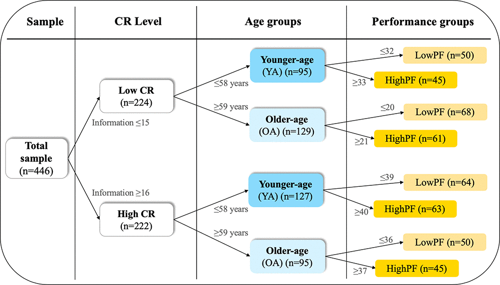 To address the three aims of this study, we stratified the cohort into groups of CR, performance in phonemic fluency, and age as detailed in Figure 1. Table 1 shows the demographic characteristics and Supplementary Table 1 shows cognitive performance across the CR, performance, and age groups.