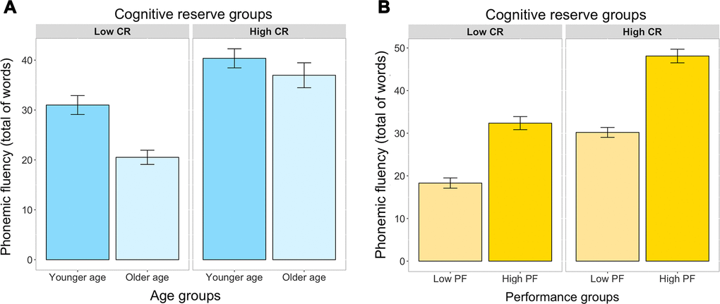 The significant interaction between CR and performance group revealed that the difference between low phonemic fluency (lowPF) and high phonemic fluency (highPF) performance groups was greater in the highCR group than in the lowCR group (Figure 1B). Hence, higher CR increases performance on phonemic fluency, irrespectively of the age (the partial effect of age was controlled for in the ANCOVA).