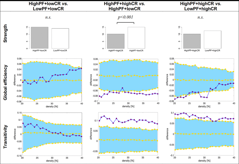 As in the previous section, we reduced the number of comparisons as part of our third aim by performing follow-up analyses guided by the findings from the random forest models above. We were interested in comparing the highPF+highCR group against the lowPF+highCR and highPF+lowCR groups, as well as in comparing the highPF+lowCR group against the lowPF+lowCR group, across graph measures (Figure 4). All these analyses were controlled for the effect of sex. The highPF+highCR group showed lower average strength than the highPF+lowCR (p<0.001), but comparable average strength than the lowPF+highCR group (p=0.246). Global efficiency was increased in highPF+highCR as compared with the highPF+lowCR group, and tended to be increased when compared to the lowPF+highCR group. Transitivity was decreased in the highPF+highCR group as compared with both highPF+lowCR and lowPF+highCR groups. When comparing the highPF+lowCR and lowPF+lowCR groups, we did not observe any significant difference in the average strength, global efficiency, or transitivity.