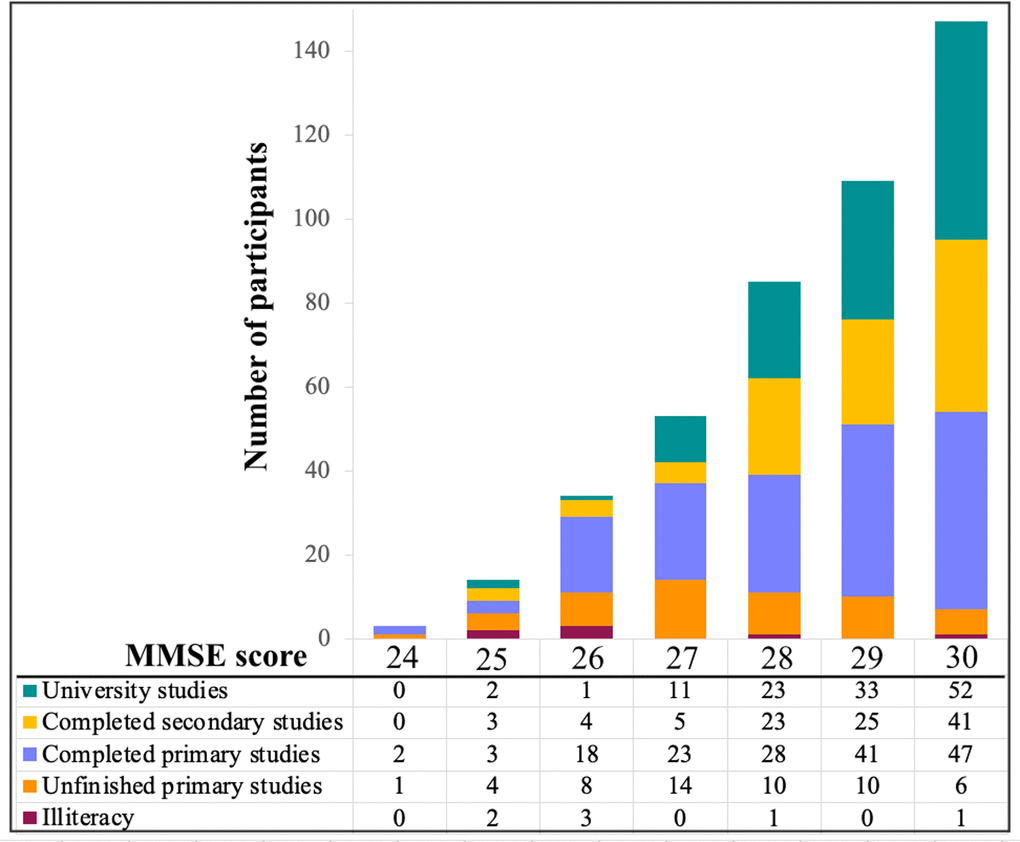 This study has some limitations. We analyzed cross-sectional data. Therefore, our age-related differences may partially be explained by cohort effects. Nonetheless, multivariate analysis methods such as random forest maximize the covariance between the predictors and the outcome variable, being less vulnerable to confounders such as cohort effects [5]. Also, we are currently collecting follow-up data so that our cross-sectional findings can be substantiated in a longitudinal design in our future studies. The literature on graph theory analysis on cognitive data is very limited, and our current study is one of the few published so far. We demonstrate that graph theory shows great potential to deepen the previous cognitive findings obtained using univariate and other multivariate methods. Another consideration is that performance in verbal fluency varies according to the type of stimulus [44]. We used the F-A-S version of phonemic fluency, and our current findings should be replicated using other stimulus such as the P-M-R version, which is also common and validated in the Spanish language [45]. Further, there is currently an ongoing discussion on whether cognitive reserve and compensation occur through a universal brain network or their effects are task-dependent [46]. Our studies are approaching this question by investigating the language function, because language is one of the few functions that can resist the onslaught of aging [1, 2], hence, possibly reflecting the result of successful compensatory mechanisms. While comprehension, semantic abilities, and vocabulary remain rather stable or even improve with age [2, 4], verbal fluency and naming decline with age [5]. We have repeatedly seen in our cohort that naming is the language component most vulnerable to age [5, 47–49]. Therefore, we focused on verbal fluency, which also provides the opportunity to compare different fluency modalities. In our previous study, we demonstrated that phonemic fluency, semantic fluency, and action fluency have different age-dependent trajectories [9]. In particular, performance in semantic fluency and action fluency showed a prominent decline with age, while phonemic fluency showed some decline with age but also showed signs of stability [9]. These characteristics make phonemic fluency an ideal cognitive function to investigate compensatory processes. However, future studies should extend our current analyses to other language components such as naming, as well as to other non-language cognitive functions. Applying random forest and graph theory analyses to different cognitive functions in the future will help to substantiate our current findings, contributing to answer the question on a universal network vs. task-dependent networks underpinning cognitive reserve and compensation. Also, extending our cognitive network analyses to neuroimaging measures is warranted in the future in order to better understand the neural correlates of our current findings. We used group-level analysis in graph measures (low vs. high fluency performance). This is the most common form of studying network topology. However, future work should explore methods that can generate individual networks [50], enabling correlations between network measures and performance in verbal fluency, age, and CR as a continuous variable. We used the WAIS-III Information subtest and our findings should be tested using other proxies of cognitive reserve. A final consideration is that we excluded individuals with mild cognitive impairment (MCI) using a comprehensive neuropsychological protocol and appropriate normative data. However, we showed that some individuals had MMSE scores in the range 24-26, mostly related to low education. These data can be seen in Figure 5. Including these individuals increases the generalization of our findings to the whole range of education, also including the strata with lowest education. Nonetheless, we acknowledge that other studies using samples with higher education have excluded individuals with an MMSE score below 27 [51].