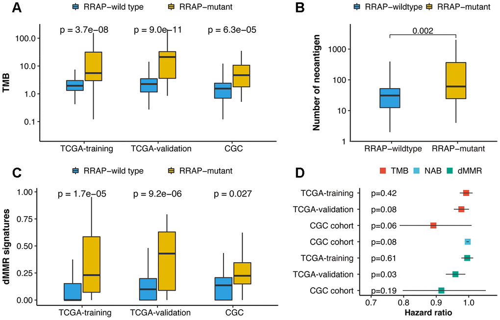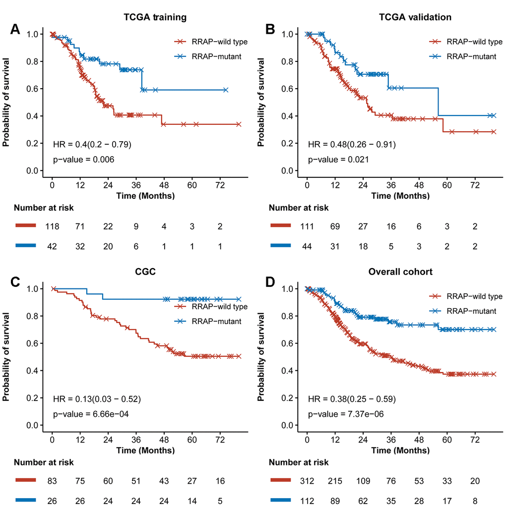 The reliability of RRAP was assessed using an independent patient cohort that was a subset of the 109 CGC patients. These patients were whole-exome sequenced, and 26 (23.9%) were identified as RRAP-mutant. This cohort exhibited a mutational proportion similar to the TCGA training (26.3%) and TCGA validation (28.3%) cohorts. For the reliability assessment cohort, Kaplan-Meier curves showed that RRAP-mutant was significantly associated with longer OS (hazard ratio = 0.13, 95% confidence interval: 0.03- 0.52, p-value = 6.66e-4, Figure 2C). Multivariate Cox regression analysis was performed as described above, and the results again showed that RRAP was an independent prognostic factor (Supplementary Figure 1C). We also merged data of the TCGA training, TCGA validation, and CGC cohorts into overall cohort. RRAP-mutant patients displayed better OS compared to RRAP-wild type patients, with a hazard ratio of 0.38 (95% confidence interval: 0.25-0.59, p-value = 7.37e-6) in the overall cohort (Figure 2D and Supplementary Figure 1D).
