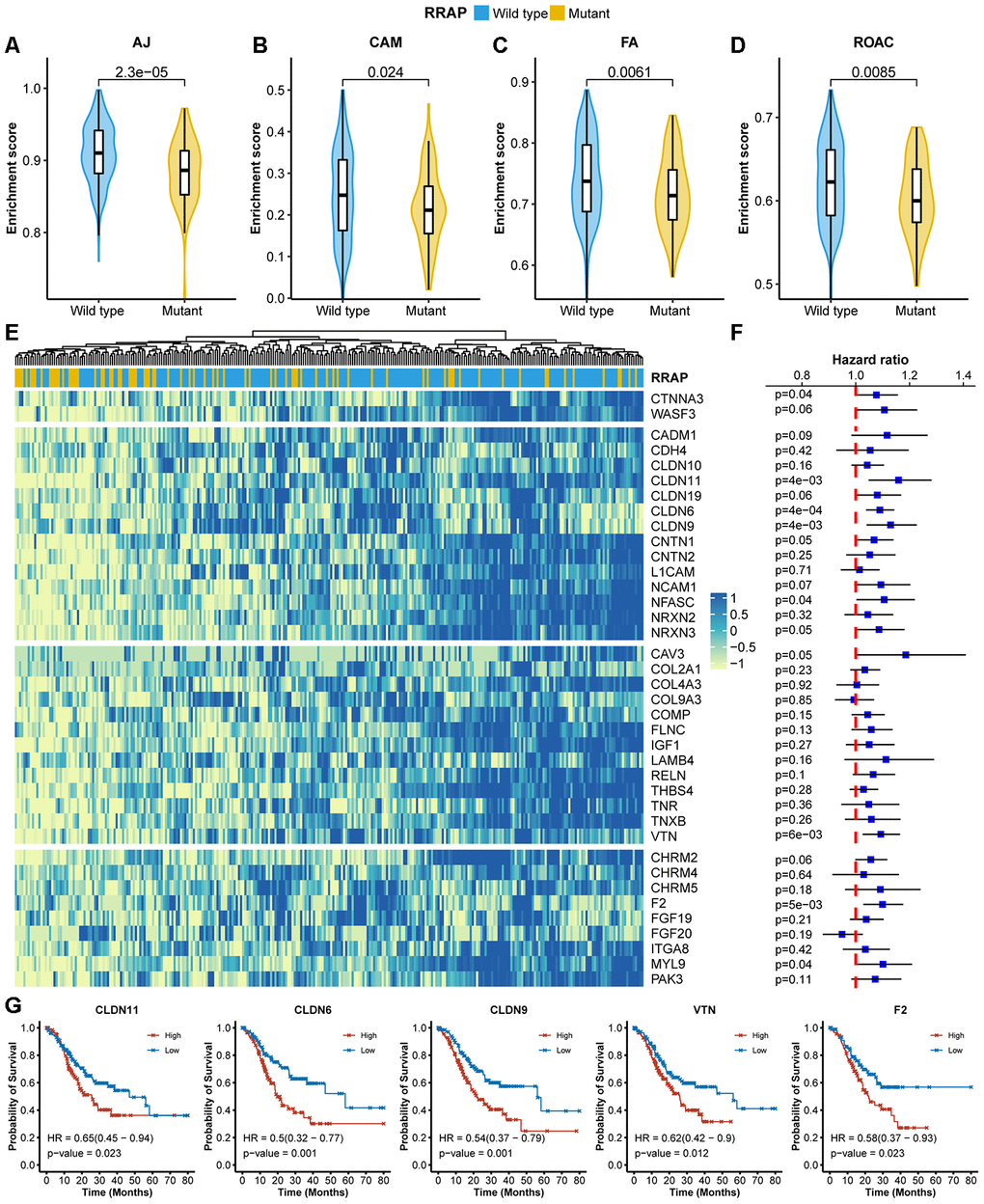 Given the role of RhoA in cell migration, we assessed the effect of RRAP on tumor metastasis. Strikingly, patients with RRAP-mutant tumors had a significantly lower rate of lymph node metastasis (pN3 of regional lymph node) compared with RRAP-wild type patients (11.5% vs 36.1%, respectively, Fisher's exact test p-value = 0.026) in the CGC cohort, which was also confirmed in the overall TCGA cohort (12.8% vs 24.7%, respectively, p-value = 0.03). We also found that patients with RRAP-mutant tumors had a moderately lower distant metastasis recurrence risk compared to patients with RRAP-wild type tumors in the CGC cohort (15.4% vs 31.3%, respectively, p-value = 0.136); the same trend was observed in the overall TCGA cohort (3.6% vs. 7.9%, respectively, p-value = 0.26). This suggested that RRAP-mutant tumors may have an impaired migration capacity. At the molecular level, we explored the RNA-seq data collected from TCGA and estimated the enrichment score of 4 migration-related functions—adherens junctions, cell adhesion molecules, focal adhesion, and regulation of the actin cytoskeleton. All of these functions showed significantly lower activity in RRAP-mutant tumors compared to RRAP-wild type tumors (Figure 3A–3D). Further analysis revealed that 39 genes related to the 4 functions exhibited significantly lower expression in RRAP-mutant tumors (log2 fold change > 1 and adjusted p-value < 0.01, Figure 3E). We next performed univariate Cox and Kaplan-Meier analysis on the 39 genes and found that 5 genes (CLDN11, CLDN6, CLDN9, VTN, and F2;Supplementary Table 2) were significantly associated with poor OS (Figure 3F, log-rank p-value < 0.01). Kaplan-Meier analysis revealed that the low expression of these 5 genes, along with CNTN1, CNTN2, CADM1, NCAM1, FGF19, and FGF20, were significantly associated with better OS (Figure 3G, Supplementary Figure 2). Taken together, these results indicated an association between RRAP mutation and tumor cell migration, thus resulting in metastasis.