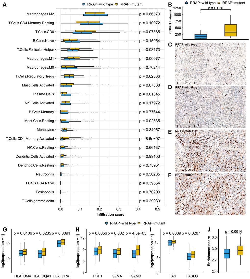 In addition to the 3 signatures above, we further explored the association between RRAP and the TME using TCGA expression data. For this purpose, we collected tumor immune infiltrate data published by TCGA and compared immune cellular fraction between RRAP-mutant and RRAP-wild type tumors [23]. RRAP-mutant tumors showed significantly higher levels of infiltration of activated CD4+ memory T cells (p-value = 8.6e-7) and M1 macrophages (p-value = 0.00077) (Figure 5A), both of which are reportedly associated with longer survival in multiple cancers [24, 25]. In addition, we observed higher infiltration of CD8+ T cells—the primary effector in anti-tumor immunity—in RRAP-mutant tumors compared to RRAP-wild type tumors, although it did not reach a statistical significance (p-value = 0.07385, Figure 5A). There was a significantly difference in the levels of CD8+ infiltration in the independent CGC cohort. IHC staining was used to evaluate the infiltration of CD8+ tumor infiltrating lymphocytes (TILs) in 52 tumors from the CGC cohort; 40 of these were RRAP-wild type tumors and 12 were RRAP-mutant tumors. Consistent with the TCGA RNAseq results, RRAP-mutant tumors exhibited increased infiltration of CD8+ TILs compared to RRAP-wild type tumors (p-value = 0.026) (Figure 5B–5F). Given the functional dependence of CD4+ T cells and M1 macrophages on human leukocyte antigen (HLA) class II molecules, further analyses of several HLA class II molecules were also performed. The results showed significantly higher expression of these molecules in RRAP-mutant tumors compared with RRAP-wild type tumors (Figure 5G), including HLA-DMA (p-value = 0.0106), HLA-DQA1 (p-value = 0.0235), and HLA-DRA (p-value = 0.0091). Taken together, an increased anti-tumor immune response by CD4+ T cells and macrophages could be seen for RRAP-mutant tumors.