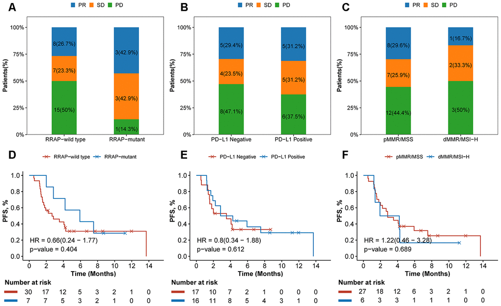 Inspired by the significant effect of RRAP on prognosis, immune-related signatures and the TME, we further investigated the association between RRAP and the response to ICB therapy. Of the IM1 cohort who received ICB therapy (N = 37), 7 patients were identified as RRAP-mutant and 30 were RRAP-wild type. After treatment, 15 (50%) patients in the RRAP-wild type group had progressive disease. In contrast, only 1 (14.3%) patient in the RRAP-mutant group had progressive disease (Figure 6A). We also evaluated the efficacy of ICB therapy between groups stratified by PD-L1 expression and microsatellite instability (MSI) and/or mismatch repair (MMR) status, and no notable differences were found (Figure 6B, 6C). The Kaplan-Meier curves suggested that RRAP-mutant favored PFS compared with RRAP-wild type (Figure 6D), with respective median PFS times of 5.93 months (95% confidence interval: 2.83-not available) and 2.67 months (95% confidence interval: 1.70-not available). However, there was no difference in PFS between PD-L1-positive and PD-L1-negative patients (median PFS: 3.55, 95% confidence interval: 1.93-not available and 3.53, 95% confidence interval: 1.57-not available, respectively) (Figure 6E). The same observation was made when comparing dMMR/MSI-H and pMMR/MSS patients (median PFS: 3.07 95% confidence interval: 1.37-not available and 2.83, 95% confidence interval: 2-not available, respectively) (Figure 6F). In the IM2 cohort (N = 47), 12 patients were classified as RRAP-mutant; these patients had a better overall response rate than RRAP-wild type patients (33.3% vs 8.6%, respectively, Fisher's exact test p-value = 0.06). These results suggested that RRAP may play a role as a potential predictive biomarker for checkpoint inhibitor-based immunotherapy in gastric cancer.