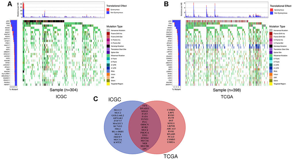 For TCGA, we downloaded the “Masked Somatic Mutation” subtype of somatic mutation data and used the VarScan software for processing. We used an R package called “maftools” [45] to analyze and visualize the Mutation Annotation Format of somatic variants. We annotated TSV files containing somatic variant information from ICGC according to the hg19 reference genome. Both cohorts were visualized by the GenVisR package. The definition of TMB is the total number of coding errors of somatic genes per million bases, including base-pair substitutions, insertions, and deletions [20]. We counted all base-pair substitutions in the coding region of specific genes, except silent mutations that failed to alter amino acids. To calculate the TMB score of each sample, we divided the total number of mutations by the exome size (38 Mb). We analyzed the difference in overall survival rates between the mutated and wide-type groups using an R package called “survival.”