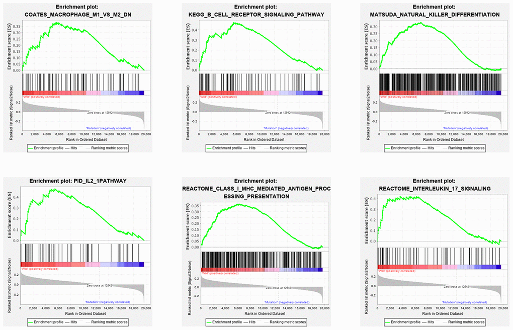 We performed ssGSEA to acquire the enrichment score for each immune-related pair [46] and sample using an R package called “GSVA” [47] (Supplementary Table 1). We obtained 30 immune gene sets from several literature sources, including immune cell types and functions [48], tumor-infiltrating lymphocytes (TILs) [49], proinflammatory [50], para-inflammation (PI) [51], cytokine and cytokine receptor (CCR) [52], human leukocyte antigen (HLA) [53], regulatory T (Treg) cells [54], and immune checkpoints [55]. The ssGSEA applied gene signatures expressed by immune cells and pathways to the colon cancer samples. The approach used in our study involved immune cells and pathways in innate and adaptive immunity. We used an R package called “ESTIMATE” to calculate the immune score, tumor purity, and stromal score of every tumor sample [56]. The stromal score is defined as the presence of stroma in tumor tissue. The immune score is defined as the infiltration of immune cells in tumor tissue. The tumor purity score is defined as tumor purity. We performed GSEA to explore the correlated pathways of KRAS mutation. Gene ontology gene sets “c2.cp.v7.0.symbols.gmt” obtained from the Molecular Signatures Database (MSigDB, http://software.broadinstitute.org/gsea/downloads.jsp) were used for the enrichment analysis. The enriched gene set was considered statistically significant when the p value was less than 0.05. We demonstrated the correlation between KRAS mutations and immune cell infiltration by comparing the immune cell infiltration in KRAS-mutated and wild-type groups.