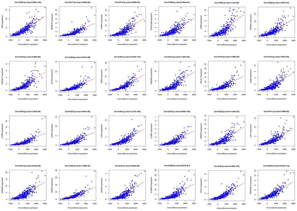 We analyzed TMB, HLA gene expression, and checkpoint-related genes in the KRAS-mutated and wild-type groups. Among the 19 HLA genes, 12 showed significantly lower expression levels in the KRAS-mutated group compared to the wild-type group (Figure 6A). For the checkpoint-related genes, we observed that BTLA, CD80, CD86, CTLA4, IDO1, PDCD1LG2, and TIGIT had decreased expression in the KRAS-mutated group (Figure 6B). Gene mutations can generate neoantigens that mediate anti-tumor immune activities, and TMB has also been shown to have a strong correlation with tumor immunity. However, there were no significant differences in TMB between the KRAS-mutated and wild-type groups. This suggests that TMB cannot explain their difference in immunity (Figure 6C). RAS-related pathways obtained from KEGG included RAP1, PI3K-ATK, mTOR, MAPK, FOXO, and ERBB signaling pathways. With the exception of mTOR and ERBB signaling pathways, most of the RAS-related pathways positively correlated with the immune signature. RAS (r = 0.61) and FOXO (r = 0.5) signaling pathways had strong positive correlations with neutrophils. RAS (r = 0.53) and PI3K-ATK signaling pathways (r = 0.56) exhibited a positive correlation with macrophages. There was also a positive correlation between the RAS signaling pathway and T-helper cells. Interestingly, neutrophils, macrophages, and T-helpers also showed differences in ssGSEA between the KRAS-mutated and wild-type groups. Finally, we used the Wilcoxon test to screen for differently expressed genes between the KRAS-mutated and wild-type groups, with FDR < 0.05. We calculated the Pearson correlation coefficients between these differentially expressed genes (Supplementary Table 6) and the immune score of every colon cancer sample from the TCGA datasets. We identified 24 genes, which had cor > 0.8 and p < 0.05 (Figure 7, Supplementary Table 7). The annotations of these genes are shown in Supplementary Table 8. KRAS mutations may affect the expression of these genes to further adjust the immune microenvironment.