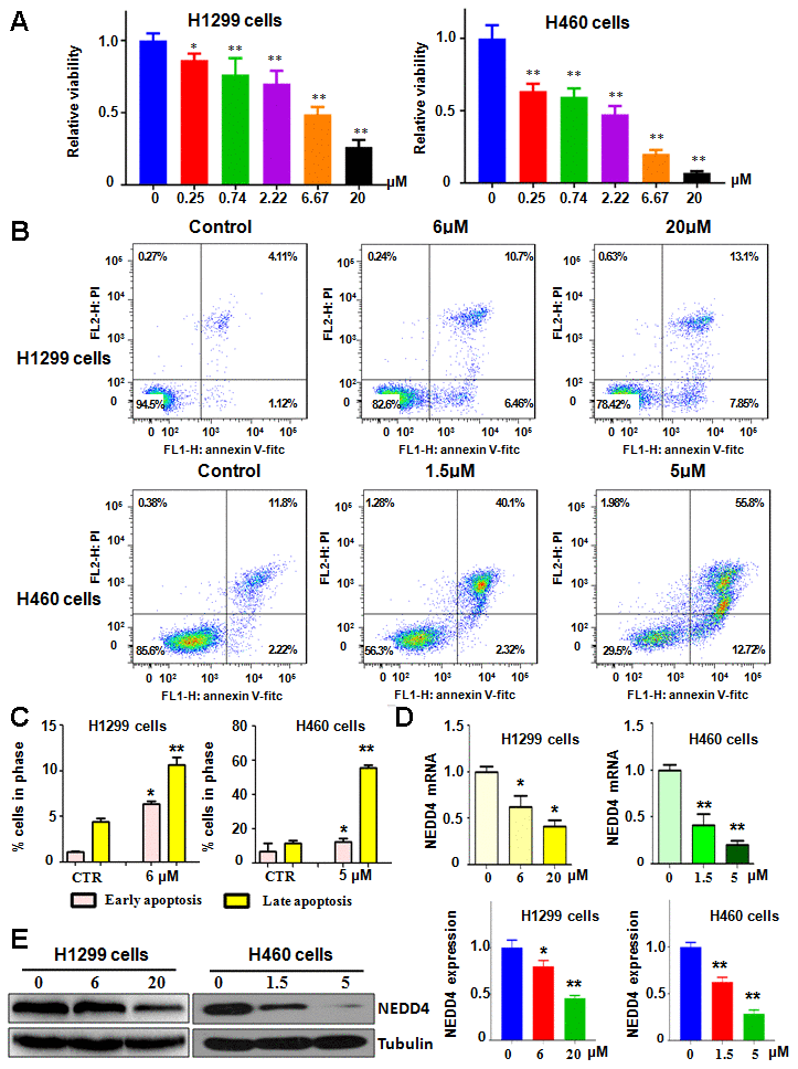 NEDD4 functions as a key oncoprotein in carcinogenesis. We explored whether NC performed cell viability inhibition via downregulation of NEDD4 in lung cancer cells. To achieve this aim, we used RT-PCR and western blotting analysis to assess the expression of NEDD4 in H1299 and H460 cells after NC treatments. Our data showed that NC suppressed the expression of NEDD4 at both mRNA and protein levels in both H1299 and H460 cells (Figure 1D, 1E). This finding indicates that NEDD4 inhibition by NC could be a reason for the NC-mediated suppression of cell viability.