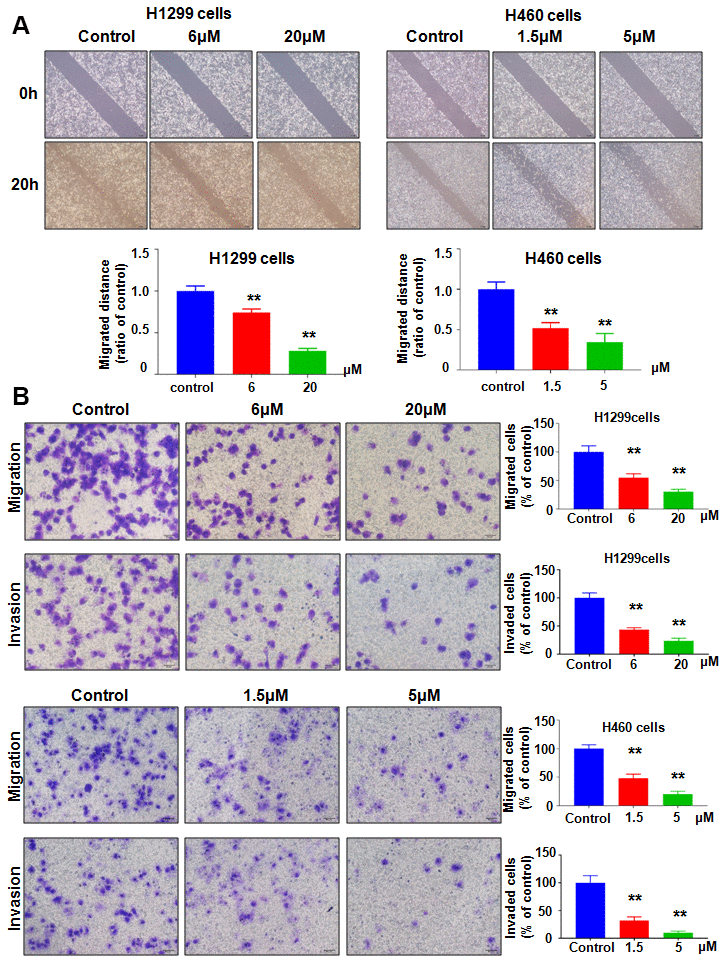 NEDD4 governs cell motility in tumor cells. Therefore, we tested whether NC inhibited NEDD4 expression and led to suppression of migration and invasion of lung cancer cells. Our wound healing assay showed that NC exposure resulted in retardation of wound closure in both H1299 and H460 cells (Figure 2A). Transwell chamber migration and invasion assays dissected that NC exposure attenuated the cell migratory and invasive activity of H1299 and H460 cells (Figure 2B). Altogether, the mobility of lung cancer cells was decreased with NC treatment.