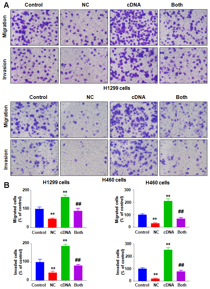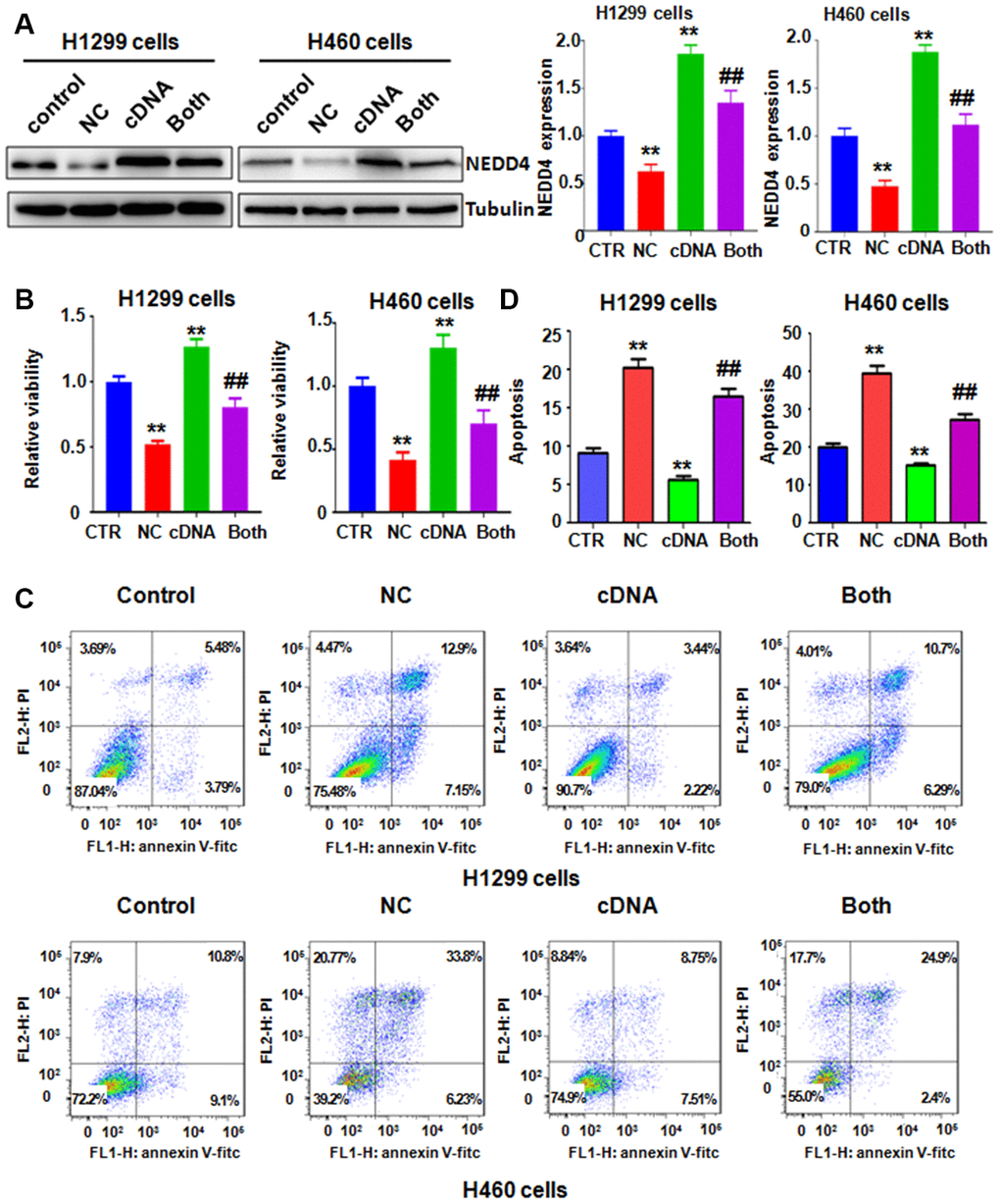 To evaluate whether the antitumor effects of NC are mediated via regulation of NEDD4, we transfected a cDNA plasmid into lung cancer cells to increase the NEDD4 level and detected whether upregulation of NEDD4 could reverse the anticancer effect of NC on lung cancer cells. Our western blotting data showed that NEDD4 was highly expressed in H1299 and H460 cells after NEDD4 cDNA plasmid transfection (Figure 3A). Strikingly, NEDD4 cDNA transfection rescued the reduction of NEDD4 induced by NC treatment in both H1299 and H460 cells (Figure 3A). Next, we assessed whether increased NEDD4 abolished the NC-triggered suppression of cell viability in lung cancer cells. Our MTT data demonstrated that NEDD4 overexpression promoted cell viability in H1299 and H460 lung cancer cells (Figure 3B). Moreover, overexpression of NEDD4 neutralized the reduction in cell viability induced by NC exposure in lung cancer cells (Figure 3B). In support of these data, we observed that NEDD4 upregulation reduced the apoptotic death of lung cancer cells (Figure 3C, 3D). Importantly, NEDD4 upregulation the abrogated NC-triggered induction of cell apoptosis in H1299 and H460 lung cancer cells (Figure 3C, 3D). The migration of lung cancer cells after NEDD4 cDNA transfection plus NC exposure was also evaluated by Transwell chamber migration assay. NEDD4 upregulation facilitated the migratory activity of H1299 and H460 cells (Figure 4A, 4B). Notably, upregulation of NEDD4 abolished the NC-induced retardation of cell migration in lung cancer cells (Figure 4A, 4B). Consistently, NEDD4 overexpression by cDNA transfection enhanced the cell invasive ability of H1299 and H460 cells (Figure 4A, 4B). Overexpression of NEDD4 reversed the NC-involved reduction in cell invasion in lung cancer (Figure 4A, 4B). Thus, NC conducted antitumor effects in lung cancer cells in part via attenuation of NEDD4 expression.
