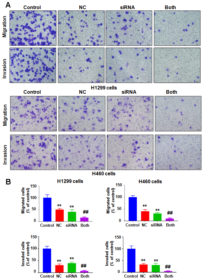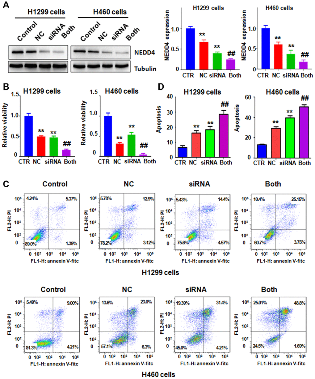 To define the potential role of NEDD4 in NC-involved antitumor activity in lung cancer, we decreased NEDD4 expression using NEDD4 siRNA transfection and cotreated the H1299 and H460 cells with NC. Our immunoblotting data demonstrated that siRNA treatment remarkably reduced the expression of NEDD4 in H1299 and H460 cells (Figure 5A). NC in combination with NEDD4 siRNA transfection reduced the NEDD4 level to a lower level than that with single NC exposure or NEDD4 siRNA treatment only (Figure 5A). MTT data revealed that NEDD4 downregulation reduced cell viability in H1299 and H460 cells (Figure 5B). The NC and NEDD4 siRNA combinations led to a greater reduction in cell viability of lung cancer cells than that after single treatment (Figure 5B). Similarly, NEDD4 suppression by siRNA transfection stimulated the apoptosis of H1299 and H460 lung cancer cells (Figure 5C, 5D). The combination of NC and NEDD4 downregulation led to enhanced cell apoptosis compared with single treatment (Figure 5C, 5D). Finally, NEDD4 inhibition attenuated the migratory and invasive abilities ofH1299 and H460 lung cancer cells (Figure 6A, 6B). Consistently, combination treatments of the lung cancer cells led to a higher suppression of cell migration and invasion than NC treatment alone or NEDD4 downregulation alone (Figure 6A, 6B).
