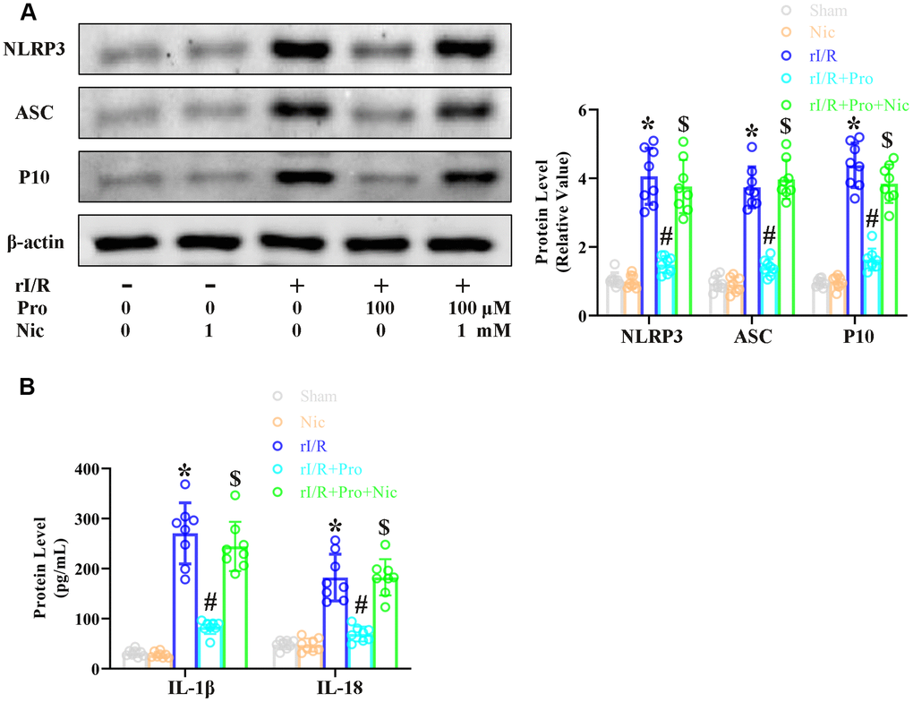 To complete our in vitro study, we used the SIRT1 inhibitor nicotinamide to evaluate whether the effects of propofol depended on SIRT1 in NR8383 cells. The cells were incubated with serum from rI/R rats, with or without propofol (100 μM) and/or nicotinamide (1 mM) for 24 h. Western blotting indicated that NLRP3 protein levels increased to 4.1-fold of control levels in the rI/R group, decreased to 1.4-fold of control levels in the rI/R + propofol group, and increased again to 3.8-fold of control levels in the rI/R + propofol + nicotinamide group (P<0.05, Figure 3A). P10 and ASC levels respectively increased to 4.4- and 3.7-fold of control levels in the rI/R group, decreased to 1.4- and 1.6-fold of control levels in the rI/R + propofol group, and increased to 3.8- and 3.9-fold of control levels in the rI/R + propofol + nicotinamide group (P<0.05, Figure 3A). Furthermore, ELISAs indicated that suppressing SIRT1 using nicotinamide reversed the effects of propofol on IL-18 and IL-1β levels (P<0.05, Figure 3B). These results indicated that SIRT1 was a crucial facilitator of the anti-pyroptotic effects of propofol in rI/R-induced NR8383 cells.