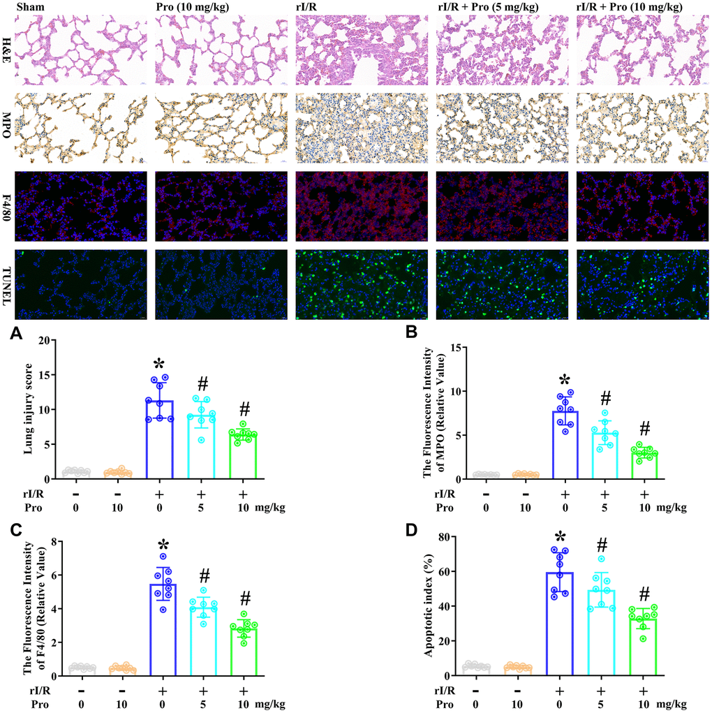 Next, we examined the effects of propofol on the morphological characteristics of rI/R-induced ALI in rats. We obtained lung tissues from our rat model of rI/R-induced ALI, and used these tissues for hematoxylin and eosin (H&E) staining, immunohistochemical analysis of myeloperoxidase, immunofluorescence analysis of F4/80, and terminal deoxynucleotidyl transferase dUTP nick end labeling (TUNEL) analysis. Rats subjected to a sham operation were used as controls. Compared with the sham treatment, rI/R increased the lung injury score 10.5-fold, the fluorescence intensity of myeloperoxidase 13.9-fold, the fluorescence intensity of F4/80 10.7-fold, and the apoptotic index (%) 10.9-fold (Figure 4). Treatment of rI/R rats with propofol (5 or 10 mg/kg) remarkably and dose-dependently reduced these four measures (P<0.05, Figure 4A–4D). Specifically, with the respective doses of propofol, the lung injury scores were reduced to 8.6- and 5.9-fold of sham levels, the fluorescence intensity levels of myeloperoxidase were reduced to 9.4- and 5.4-fold of sham levels, the fluorescence intensity levels of F4/80 were reduced to 8.0- and 5.5-fold of sham levels, and the apoptotic indexes (%) were reduced to 9.0- and 6.0-fold of sham levels (P<0.05, Figure 4A–4D). These results demonstrated that propofol ameliorated the morphological characteristics of rI/R-induced ALI in rats.