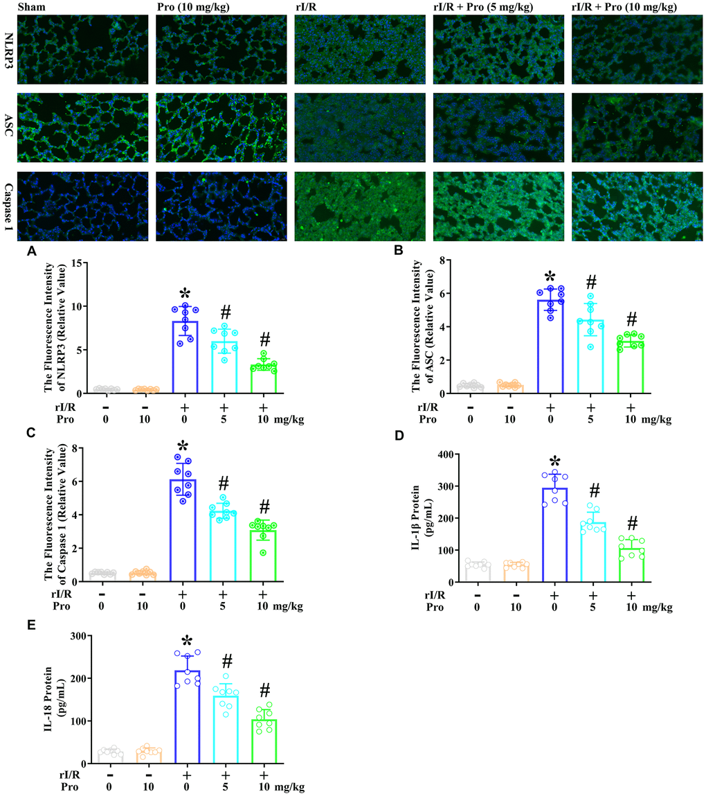 We then examined the effects of propofol on the rI/R-induced activation of pyroptotic proteins. We performed immunofluorescence analyses to evaluate the protein levels of cleaved caspase 1 (P10), ASC and NLRP3 in lung tissues from rats subjected to rI/R, with or without propofol treatment. As indicated in Figure 5A–5C, rI/R enhanced the fluorescence intensity of NLRP316.6-fold, the fluorescence intensity of ASC 11.2-fold, and the fluorescence intensity of caspase 1 12.2-fold compared with the sham operation. Propofol treatment at 5 and 10 mg/kg dose-dependently reduced the levels of these three proteins in the lungs of rI/R rats (P<0.05, Figure 5A–5C). Specifically, with the respective doses of propofol, the fluorescence intensity levels of NLRP3 were reduced to 12.0- and 6.6-fold of sham levels, the fluorescence intensity levels of ASC were reduced to 8.8- and 6.3-fold of sham levels, and the fluorescence intensity levels of caspase 1 were reduced to 8.5- and 6.2-fold of sham levels (P<0.05, Figure 5A–5C).