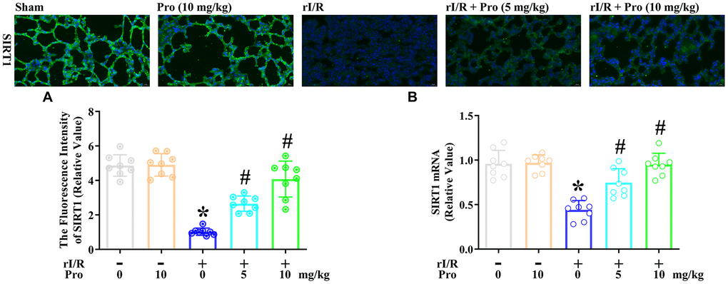 Subsequently, we assessed the effects of propofol on the mRNA and protein levels of SIRT1 in the lungs of rI/R rats. An immunofluorescence analysis indicated that rI/R reduced the fluorescence intensity of SIRT1 to 21% of the sham level, whereas further treatment with propofol at 5 and 10 mg/kg increased it to nearly 55% and 84% of the sham level, respectively (P<0.05, Figure 6A). Furthermore, real-time PCR analysis indicated that rI/R reduced the SIRT1 mRNA level to about 46% of the sham level, while the respective doses of propofol increased SIRT1 mRNA levels in rI/R rats to 78% and 99% of the sham level (P<0.05, Figure 6B).