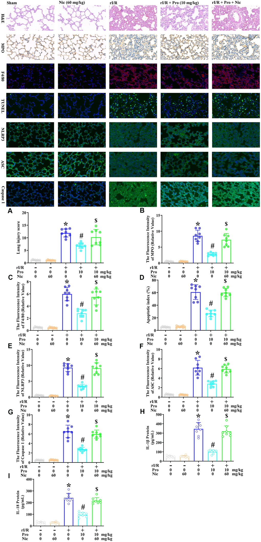 Lastly, we used the SIRT1 inhibitor nicotinamide to evaluate whether the effects of propofol depended on SIRT1 in the lungs of rats. Rats were subjected to rI/R with or without propofol (10 mg/kg) and/or nicotinamide (60 mg/kg) treatment for 24 h. Then, H&E staining, immunohistochemical analysis of myeloperoxidase, immunofluorescence analysis of F4/80, TUNEL analysis, and immunofluorescence analyses of NLRP3, ASC and caspase 1 were performed on their lung tissues. As shown in Figure 7A–7G, rI/R enhanced the lung injury score 10.9-fold, the fluorescence intensity of myeloperoxidase 17.1-fold, the fluorescence intensity of F4/80 11.8-fold, the apoptotic index (%) 11.7-fold, the fluorescence intensity of NLRP3 16.9-fold, the fluorescence intensity of ASC 11.2-fold, and the fluorescence intensity of caspase 1 13.6-fold compared with the sham operation. Propofol treatment of rI/R rats reduced the lung injury score to 6.3-fold of the sham level, the fluorescence intensity of myeloperoxidase to 5.6-fold of the sham level, the fluorescence intensity of F4/80 to 5.6-fold of the sham level, the apoptotic index (%) to 5.2-fold of the sham level, the fluorescence intensity of NLRP3 to 6.1-fold of the sham level, the fluorescence intensity of ASC to 5.2-fold of the sham level, and the fluorescence intensity of caspase 1 to 5.7-fold of the sham level. However, when nicotinamide was used to inhibit SIRT1, the effects of propofol were suppressed, such that the lung injury score increased to 9.4-fold of the sham level, the fluorescence intensity of myeloperoxidase increased to 14.6-fold of the sham level, the fluorescence intensity of F4/80 increased to 10.9-fold of the sham level, the apoptotic index (%) increased to 11.5-fold of the sham level, the fluorescence intensity of NLRP3 increased to 16.6-fold of the sham level, the fluorescence intensity of ASC increased to 10.7-fold of the sham level, and the fluorescence intensity of caspase 1 increased to 12.4-fold of the sham level (P<0.05, Figure 7A–7G). Moreover, ELISAs indicated that nicotinamide reversed the effects of propofol on IL-1β and IL-18 secretion in the lungs (P<0.05, Figure 7H, 7I). These results indicated that SIRT1 was a crucial facilitator of the anti-pyroptotic effects of propofol in the lungs of rI/R rats.