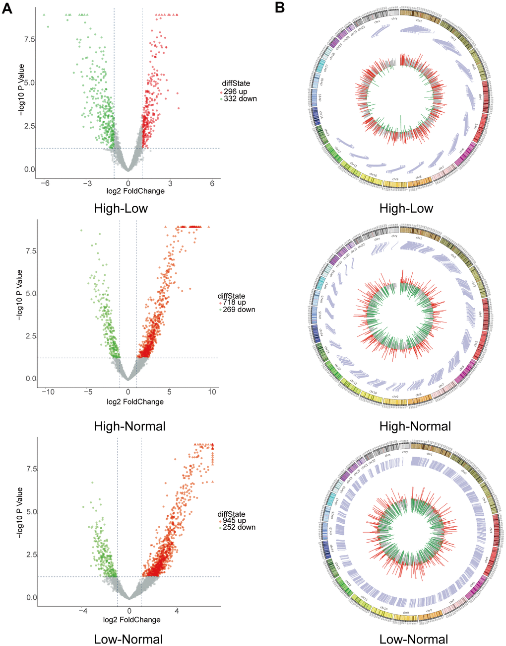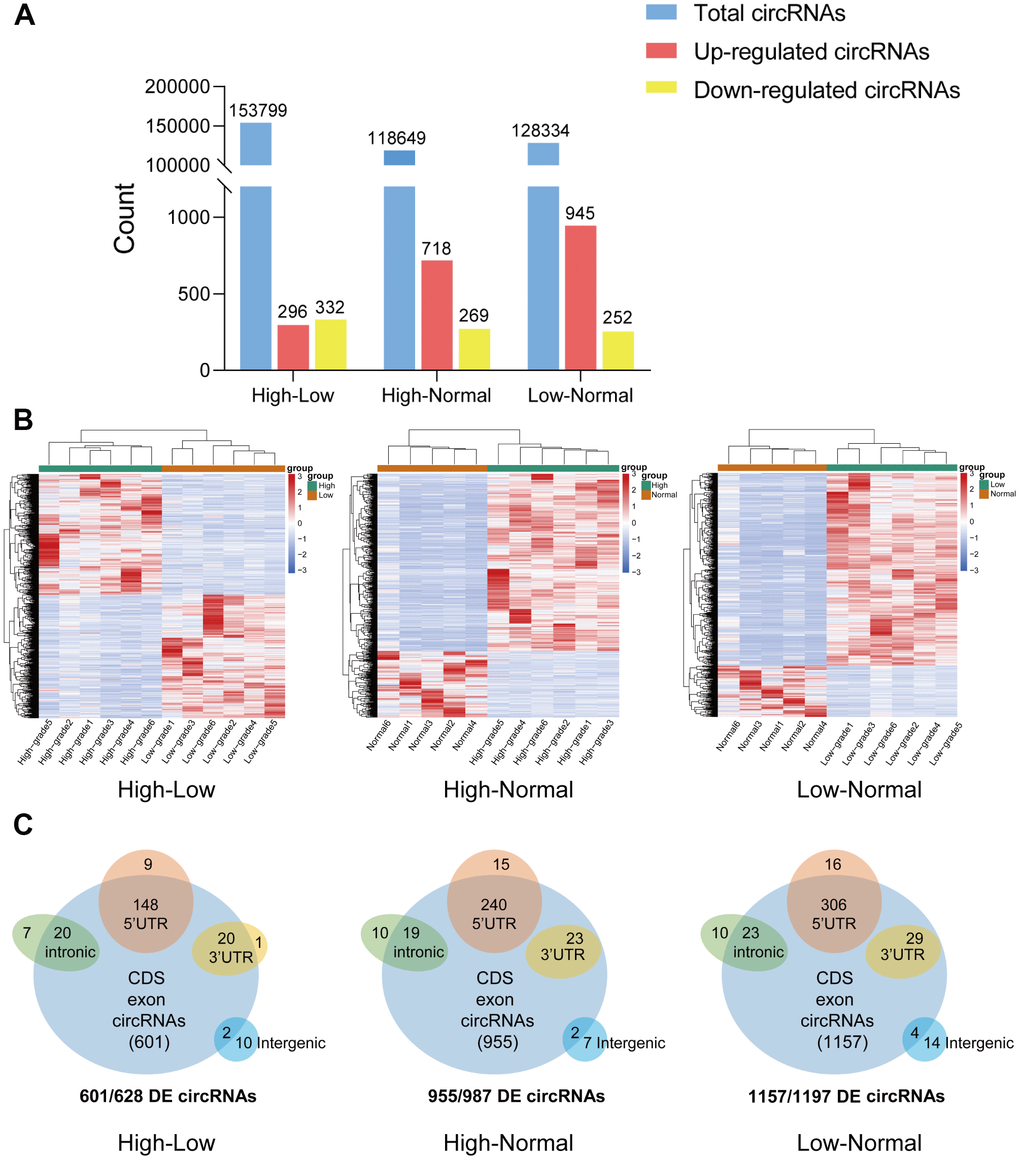 CircRNA expression profiles were performed on 6 HGG and 6 LGG patient tissues as well as 5 adjacent normal tissues. After the raw data were quantile normalized, the circRNA expression profiles were observed. A fold change (FC) > 2 and p < 0.05 were the cutoff criteria to identify differentially expressed circRNAs between each pair of groups. Eventually, a total of 153799 circRNAs were discovered in the high-low grade group. Among them, 296 exhibited upregulation and 332 showed downregulation. With regard to the high-normal grade group, 118649 circRNAs were found. Among them, 718 showed upregulation, and 269 exhibited downregulation. For the low-normal grade group, 128334 circRNAs were discovered, among which 945 showed upregulation and 252 exhibited downregulation (Figure 1A). As demonstrated by the hierarchical clustering heatmap (Figure 1B), a distinctive mode of circRNA expression was observed among the three groups. Based on how the different circRNA types were distributed, a large proportion of the circRNAs originate from exons. In comparison, other circRNAs stem from intronic and/or intergenic genomic regions (Figure 1C). How the expression of circRNAs was differentiated to a significant extent between each group is presented in the form of volcano plots (Figure 2A). The Circos plots show all the differentially expressed circRNAs compared with HGG, LGG tissue and adjacent normal brain tissue (Figure 2B), which led to the finding that every single chromosome showed differences in the expression of circRNAs.