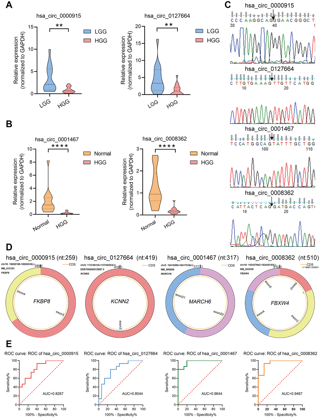 To explore the potential diagnostic value of the identified circRNAs, receiver operating characteristic (ROC) curves were analyzed. Relative to low grade, HGG patients showed a downregulation of hsa_circ_0000915 and hsa_circ_0127664 expression. To obtain the diagnostic value of these 2 circRNAs in HGG and LGG patients, a ROC curve analysis was conducted. The AUC was 0.8267 (95% CI: 0.6819–0.9714, p < 0.01) for hsa_circ_0000915 and 0.8044 (95% CI: 0.6457–0.9632, p < 0.001) for hsa_circ_0127664. Moreover, the diagnostic value of hsa_circ_0008362 and hsa_circ_0001467 was also evaluated by ROC curve analysis in HGG and normal tissue. The AUCs for hsa_circ_0008362 and hsa_circ_0001467 were 0.9467 (95% CI: 0.8728–1.000, p < 0.0001) and 0.9644 (95% CI: 0.9088–1.000, p < 0.0001), respectively. The potential diagnostic value of these circRNAs in glioma patients is displayed in Figure 3E.
