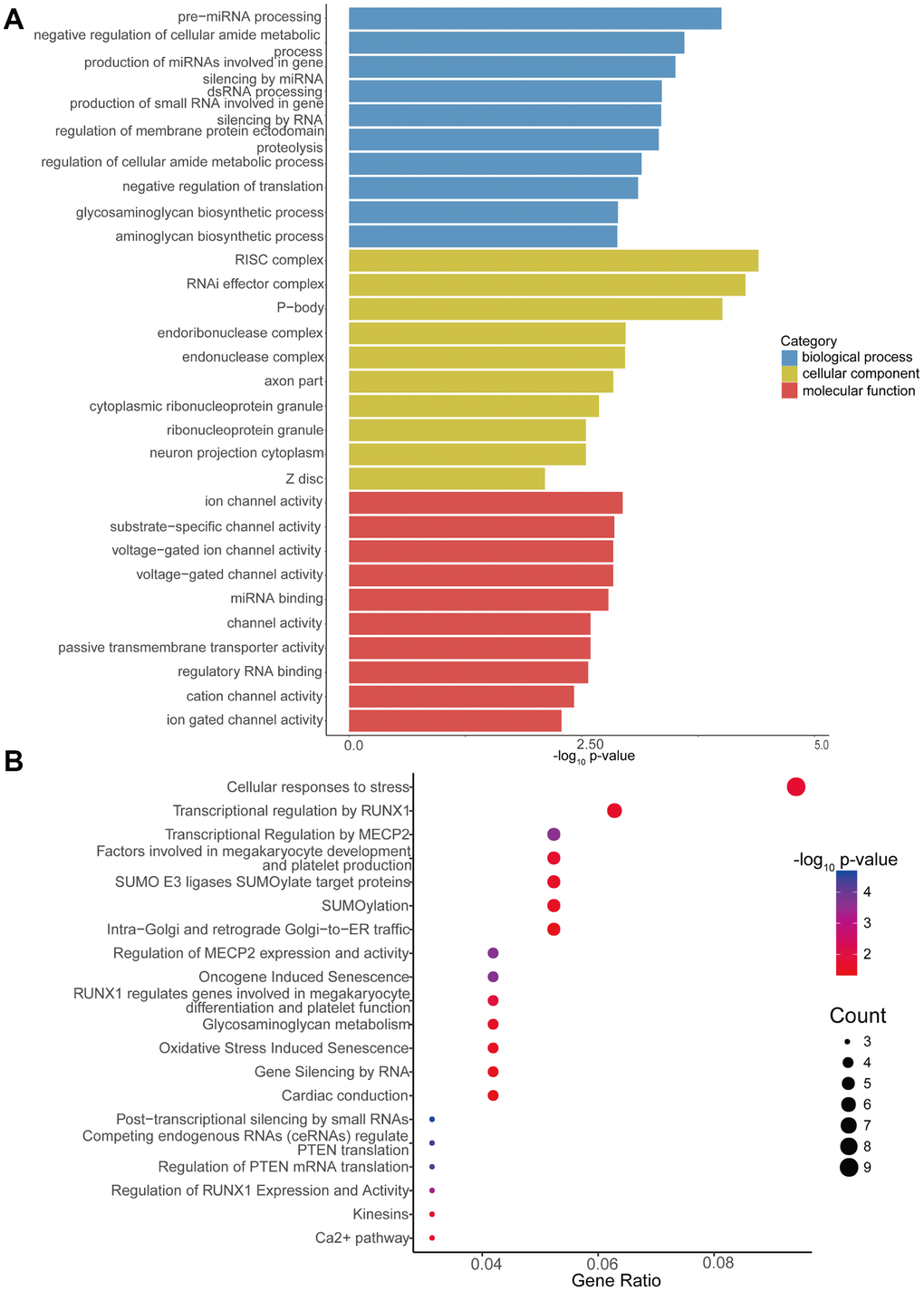 Additionally, GO enrichment and Reactome pathway analysis of the downstream target genes in high-low grade was conducted. Figure 5A presents the 10 most enriched BP, CC and MF GO terms for the target genes in high-low grade. PremiRNA processing, ion channel activity, and RISC complex were the most enriched GO entries in the BP, MF, and CC categories, respectively. In addition, the top 20 predominant pathways were displayed by Reactome pathway analysis (Figure 5B). According to the Reactome analysis, the top three pathways were cellular responses to stress (Reactome, R-HSA-2262752; p= 0.015340627), transcriptional regulation by RUNX1 (Reactome, R-HSA-8878171; p=0.021079352) and transcriptional regulation by MECP2 (Reactome, R-HSA-8986944; p=0.000234161).