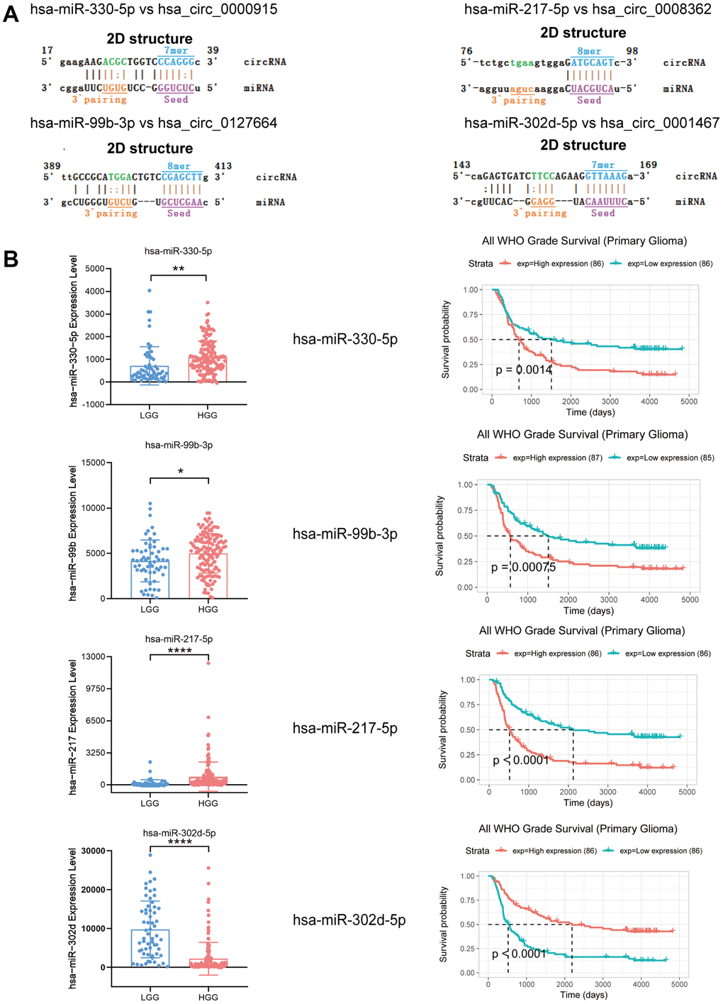 In addition, 4 target miRNAs of 4 identified circRNAs were systematically analyzed using microRNA microarray data provided by the CGGA database (LGG group n = 60; HGG group n = 138), as they were extensively reported as mRNA regulators in gliomas. For the study, hsa-miR-330-5p, hsa-miR-99b-3p, hsa-miR-217-5p, and hsa-miR-302d-5p were taken as target miRNAs of these 4 circRNAs that had been discovered. hsa-miR-330-5p, hsa-miR-99b-3p, and hsa-miR-217-5p expression levels were found to show an increasing trend in the HGG group in comparison to the LGG group, but hsa-miR-302d-5p showed a decreasing trend. As shown by survival analysis, the group with enhanced hsa-miR-330-5p, hsa-miR-99b-3p, and hsa-miR-217-5p expression showed a reduced length of survival, and hsa-miR-302d-5p showed the opposite trend (Figure 6B).
