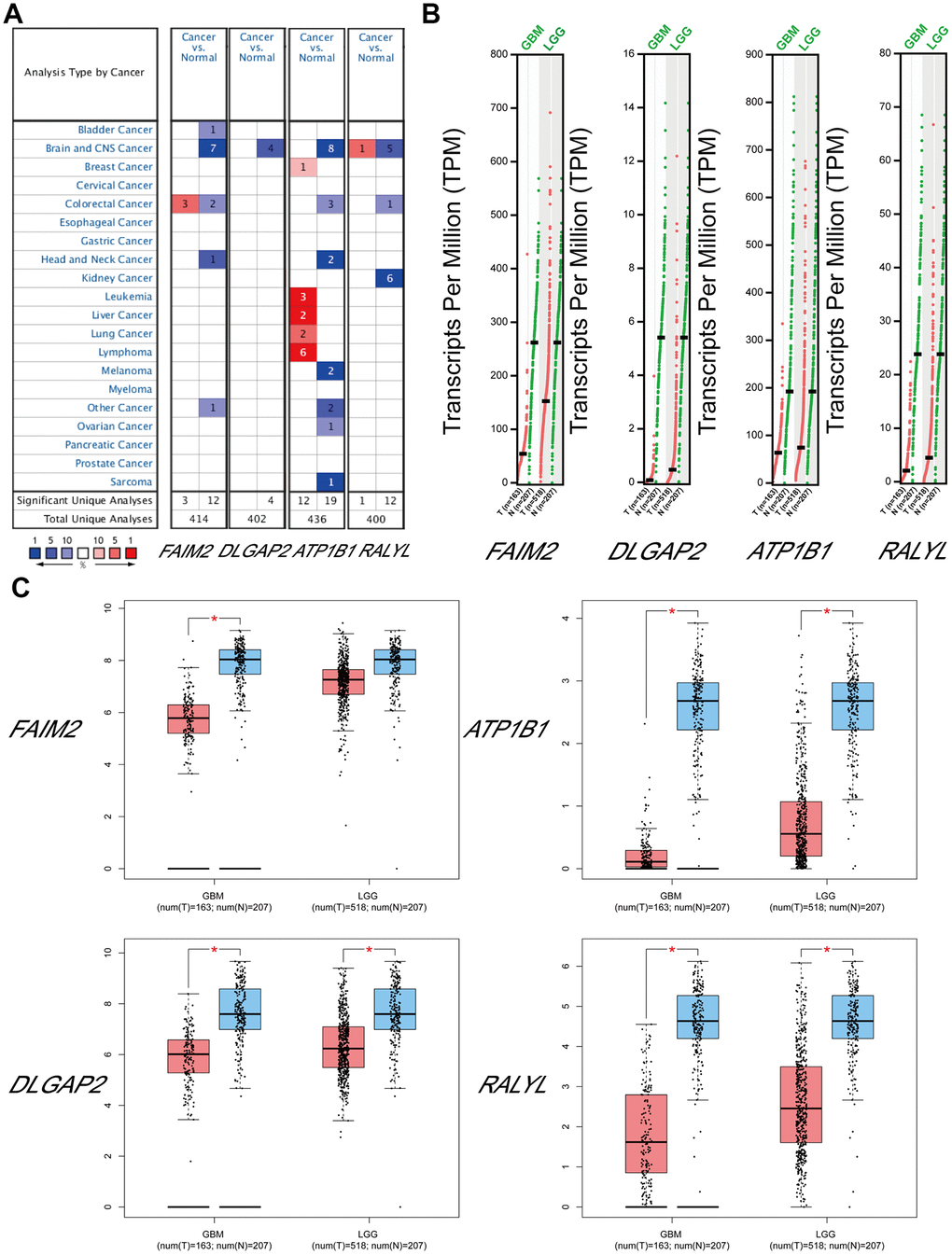 The top target genes of miRNAs were predicted by TargetScan and miRDB (Criteria: Cumulative weighted context++ score ≤ −0.24 for TargetScan, Target Score ≥ 90 for miRDB). By analysis, we found that FAIM2, DLGAP2, ATP1B1, and RALYL could be the targets of hsa-miR-330-5p, hsa-miR-99b-3p, hsa-miR-217-5p and hsa-miR-302d-5p, respectively. We compared the expression levels of FAIM2, DLGAP2, ATP1B1 and RALYL using ONCOMINE databases and found that these 4 genes were significantly downregulated in brain and CNS cancer compared with the normal group (Figure 7A). The expression data for these target genes in patients with GBM and LGG were examined by GEPIA. Compared with the normal group, FAIM2, DLGAP2, ATP1B1 and RALYL were downregulated in GBM and LGG patients (Figure 7B, 7C).