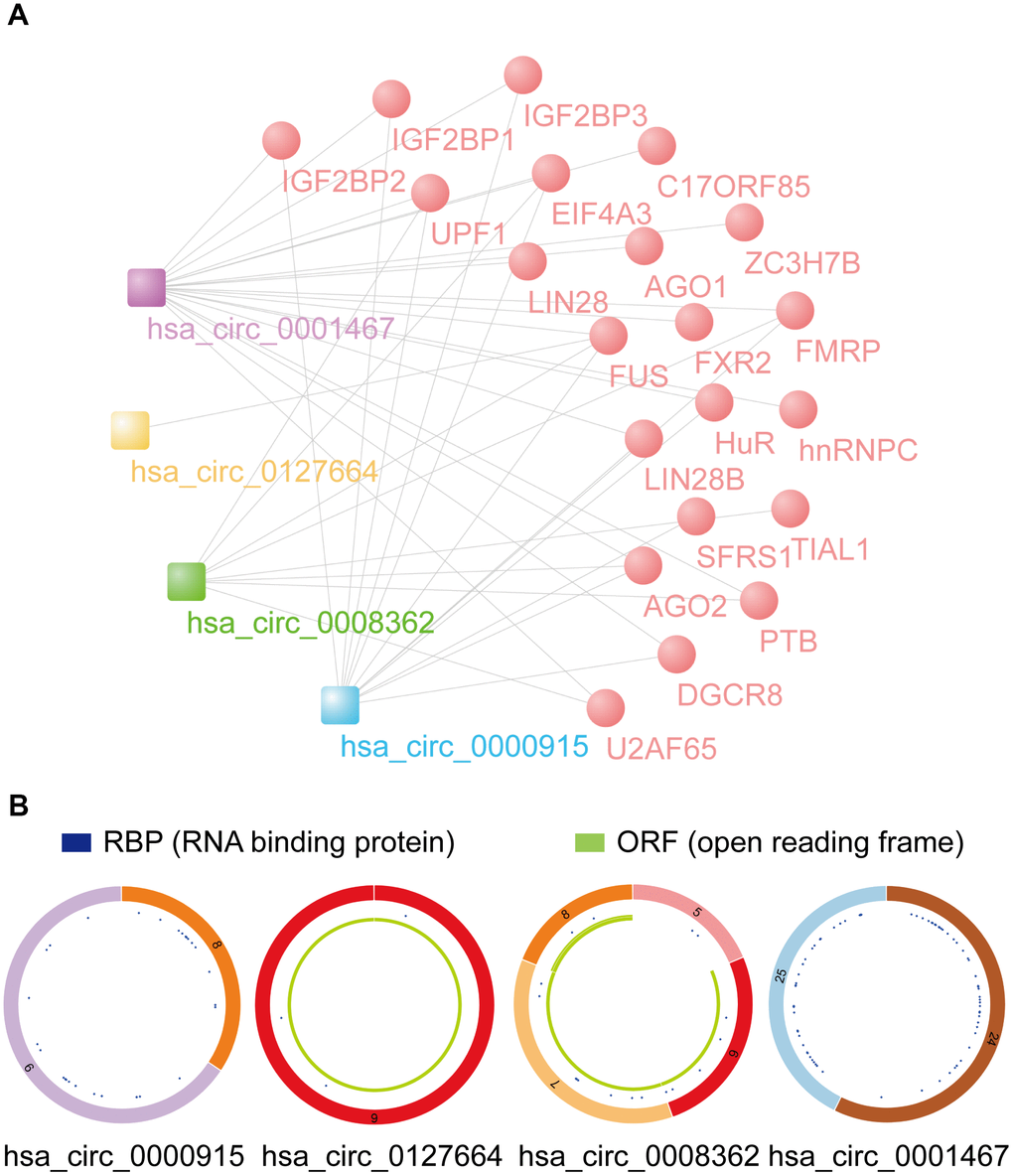 According to the data from the Cancer-Specific CircRNA Database (CSCD), RBPs binding with 4 identified circRNAs were drawn via Cytoscape software (Figure 8A). Twenty-two vital RBPs, IGF2BP1, IGF2BP3, EIF4A3, hnRNPC, and AGO2, can bind to circRNAs and may play important biological functions in glioma. According to the data from CSCD, the structure of 4 circRNAs was determined. Diagrams containing information about RBPs and ORFs are presented in Figure 8B. In addition, an interaction map of the difference in gene expression of RBPs between GBM and LGG and cancer pathway activity (activation and inhibition) was analyzed by GSCALite (Supplementary Figure 3). For example, we found that IGF2BP2, which is closely related to GBM and LGG, can be closely related to the mesenchymal transition (EMT) pathway of cancer progression.
