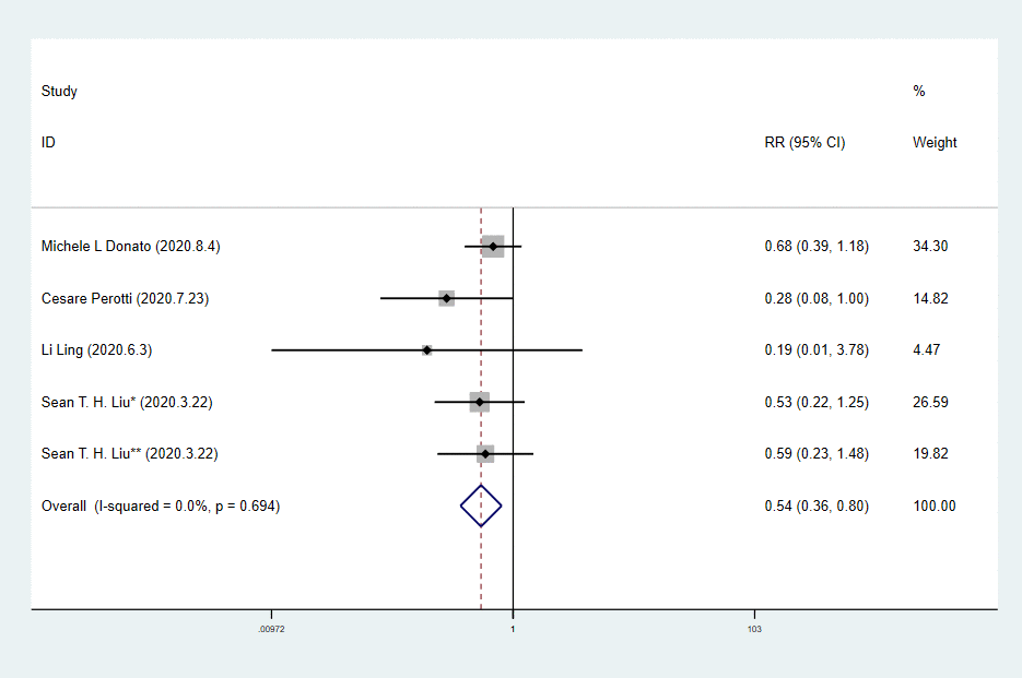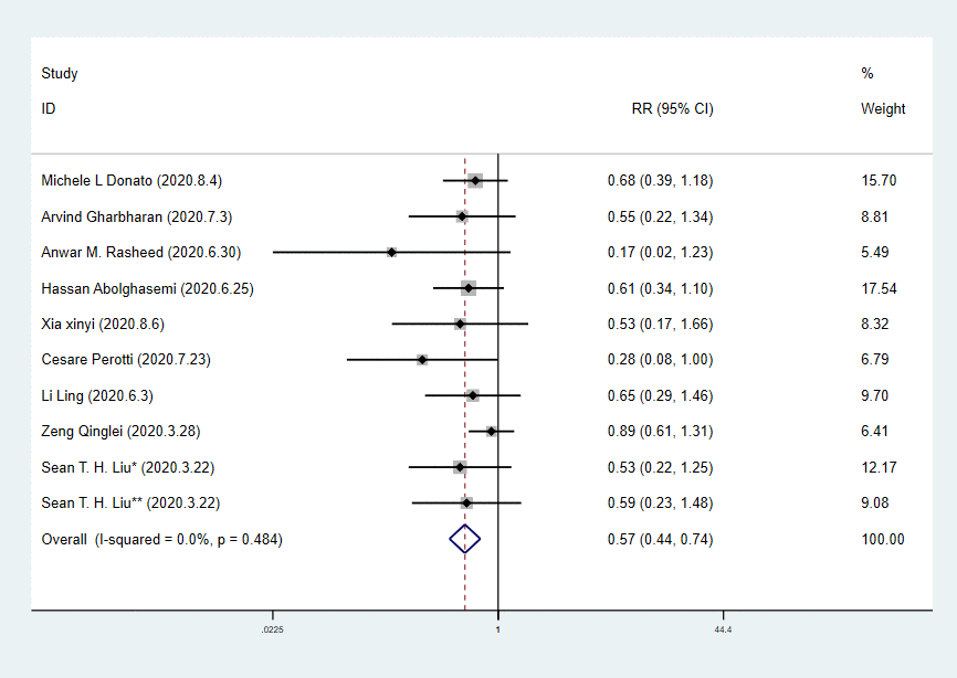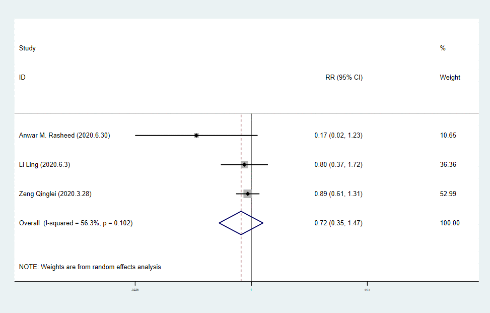 Statistical analyses were performed with STATA (version 15.1; Stata Corporation, College Station, TX, USA) for studying the mortality of patients with COVID-19. The pooled frequency with calculation of relative ratio (RR) and 95% confidence interval (CI) of RR were assessed using a fixed-effect model. The between-study heterogeneity was assessed by the I2 statistic. Publication bias was assessed statistically by using Egger's tests (p<0.05 was considered indicative of statistically significant publication bias). Subgroup analysis was also performed.