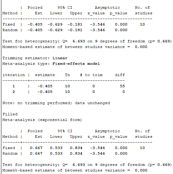 We extracted 10 sets of data from 9 controlled studies to calculate mortality of COVID-19 patients. The results of meta-analysis of mortality are shown in forest-plot (Figure 1) and a fixed-effect model (I2=0.0%) was used on the 9 studies. Our study showed that the mortality difference of COVID-19 patients treated with or without CP was statistically significant (RR=0.57 [0.44-0.74]). We assessed publication bias statistically using Egger’s test, showing that publication exists in these 9 articles included (Figure 2). We used trim and fill method with fixed-effects model to further examine the publication bias (Figure 3), and we knew that publication bias did not make an impact on the stability of our study’s results. Considering mortality might alter with severity of the disease although we knew there was no heterogeneity existing in 9 articles (I2=0.0%), we performed a subgroup analysis of severe and critical patients. Consistent with our anticipation, the mortality decreased significantly in severely ill patients treated with CP (RR=0.54 [0.36-0.80]) and a fixed-effect model (I2=0.0%) was used on 4 studies, as shown in Figure 4. But the mortality of critical patients did not reduce significantly (RR=0.72 [0.35-1.47]) and a random-effect model (I2=56.3%) was used on 3 studies, as shown in Figure 5.