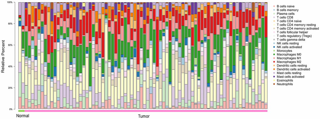 To explore the distribution of TIICs in the ESCA microenvironment, we analyzed ESCA samples in The Cancer Genome Atlas (TCGA). We found that 70-80% of the TIICs in the ESCA microenvironment were macrophages and T cells with different phenotypes (Figure 1).