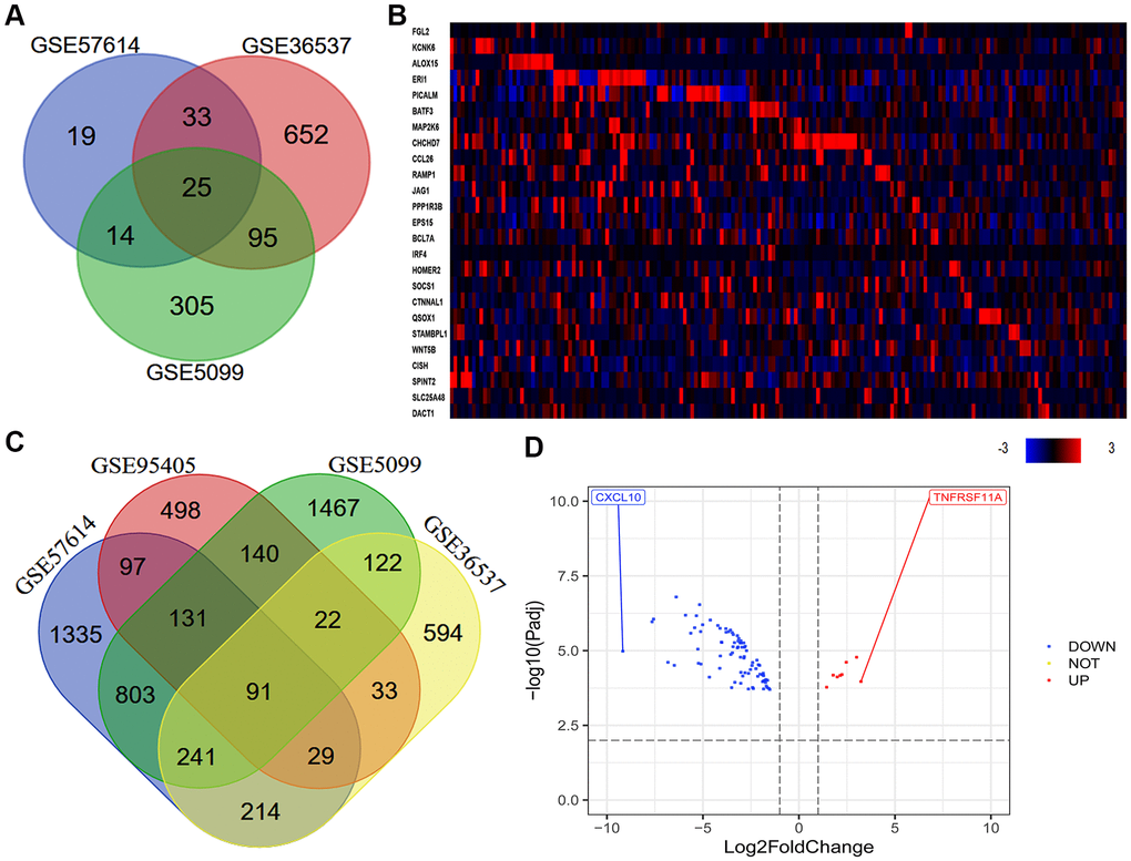 Our previous research indicated that a high density of M2 macrophages in the TME was associated with the occurrence and progression of ESCC, and with a poor prognosis in ESCC patients [6]. Thus, we used various macrophage datasets from the Gene Expression Omnibus (GEO) to identify genes that were differentially expressed between macrophages of different phenotypes. As shown in the Venn diagram in Figure 2A, we identified 25 consistently DEGs between M0 macrophages and M2 macrophages in three datasets (GSE57614, GSE36537 and GSE5099). Coincidentally, all 25 DEGs were highly expressed in samples of M2 macrophages. Next, we used cBioPortal to assess the expression of these 25 DEGs in ESCA tissues. The results revealed that some of the DEGs were highly expressed in ESCA tissues (Figure 2B). In addition, we identified 91 consistently DEGs between M1 and M2 macrophages in four datasets (GSE57614, GSE36537, GSE5099 and GSE95405) (Figure 2C). A volcano plot of the 91 DEGs demonstrated that tumor necrosis factor receptor superfamily member 11a (TNFRSF11A) was the most upregulated gene and C-X-C motif chemokine ligand 10 (CXCL10) was the most downregulated gene in M2 macrophages compared to M1 macrophages (Figure 2D).